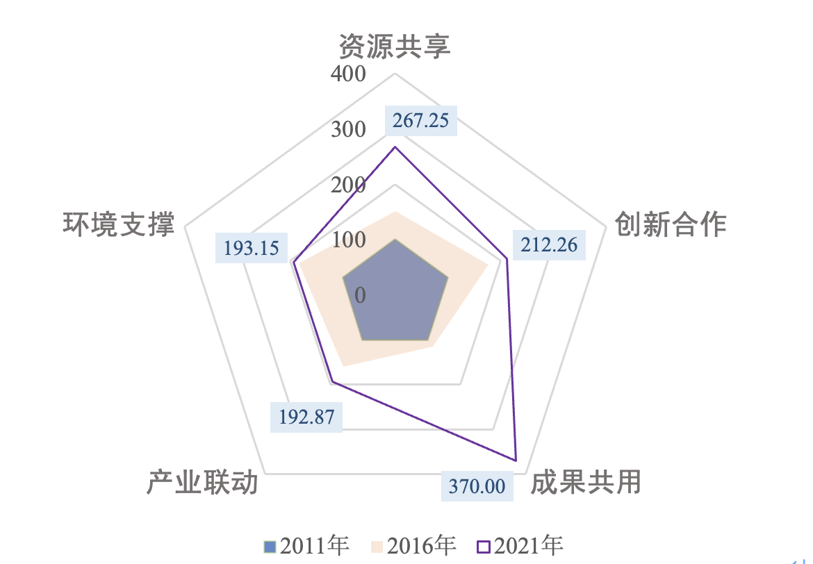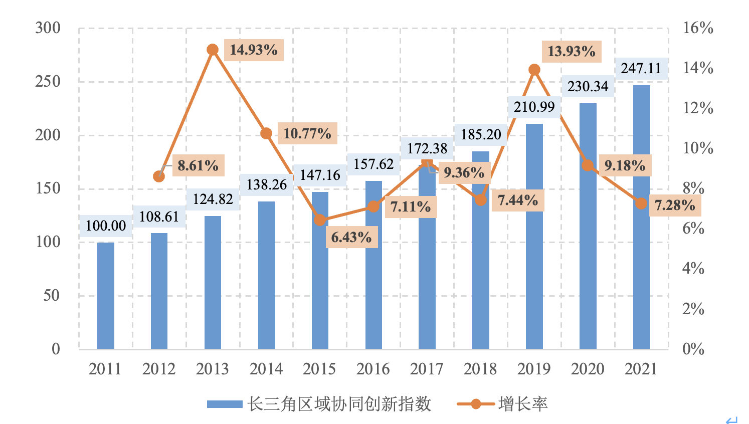 报告显示,长三角区域协同创新指数从2011年的100分(基期)增长至2021年的247.11分,较2011年增长了近1.5倍,年均增速达到9.47%,长三角科技创新一体化能力显著提升,推动高水平科技自立自强。从5项一级指标变化情况来看,成果共用指标增幅最大,从2011年的100分提高到2021年的370.00分,年均增速达到13.98%;其次是资源共享指标,从2011年的100分上升到2021年的267.25分,年均增速达到10.33%;第三是创新合作指标,从2011年的100分增长到2021年的212.26分,年均增速达到7.82%;相对而言,产业联动和环境支撑两个指标发展增速稍显缓慢,当前和未来需要不断探索长三角产业协同发展新路径,营造区域一体化的科技创新环境。