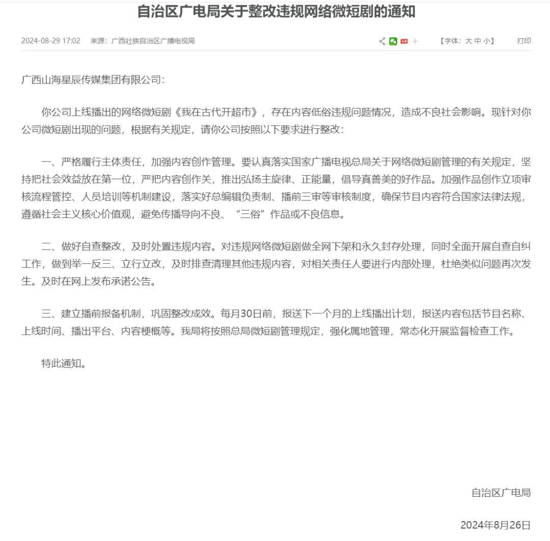 你公司上线播出的网络微短剧《我在古代开超市》,存在内容低俗违规问题情况,造成不良社会影响。现针对你公司微短剧出现的问题,根据有关规定,请你公司按照以下要求进行整改:
