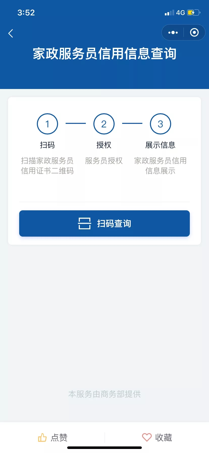 用户扫描家政服务员信用证书二维码,经服务员授权,即可展示家政服务员相关信息。