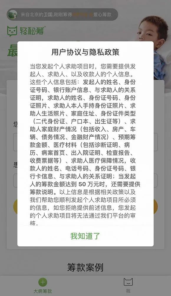 经记者体验,在下载轻松筹APP后,将弹出一份《用户协议与隐私政策》。该文件称,轻松筹APP将通过注册成为用户、发起个人求助项目、个人捐赠服务、个人求助项目证明以及授权产品权限以上六大过程中收集用户信息。值得注意的是,在发起个人求助项目时,用户同意并授权轻松筹可以收集并使用的信息包括:个人身份证件、家庭住址、医疗材料和医疗保障情况、收款人银行卡账号等敏感度颇高的隐私信息。