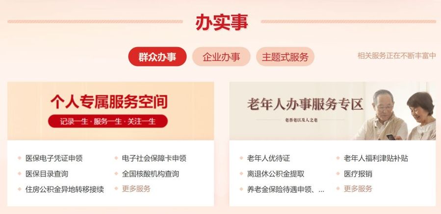 目前,“我为群众办实事,一网通办解民忧”专栏根据不同的服务对象和主题提供多项政务服务。专栏的“办实事”板块涵盖“群众办事”“企业办事”和“主题式服务”三个方面,提供“个人专属服务空间”“老年人办事服务专区”“企业专属服务空间”“‘跨省通办’服务专区”等多个集成式政务服务,还将根据群众意见不断丰富为企业和群众办实事的服务事项。