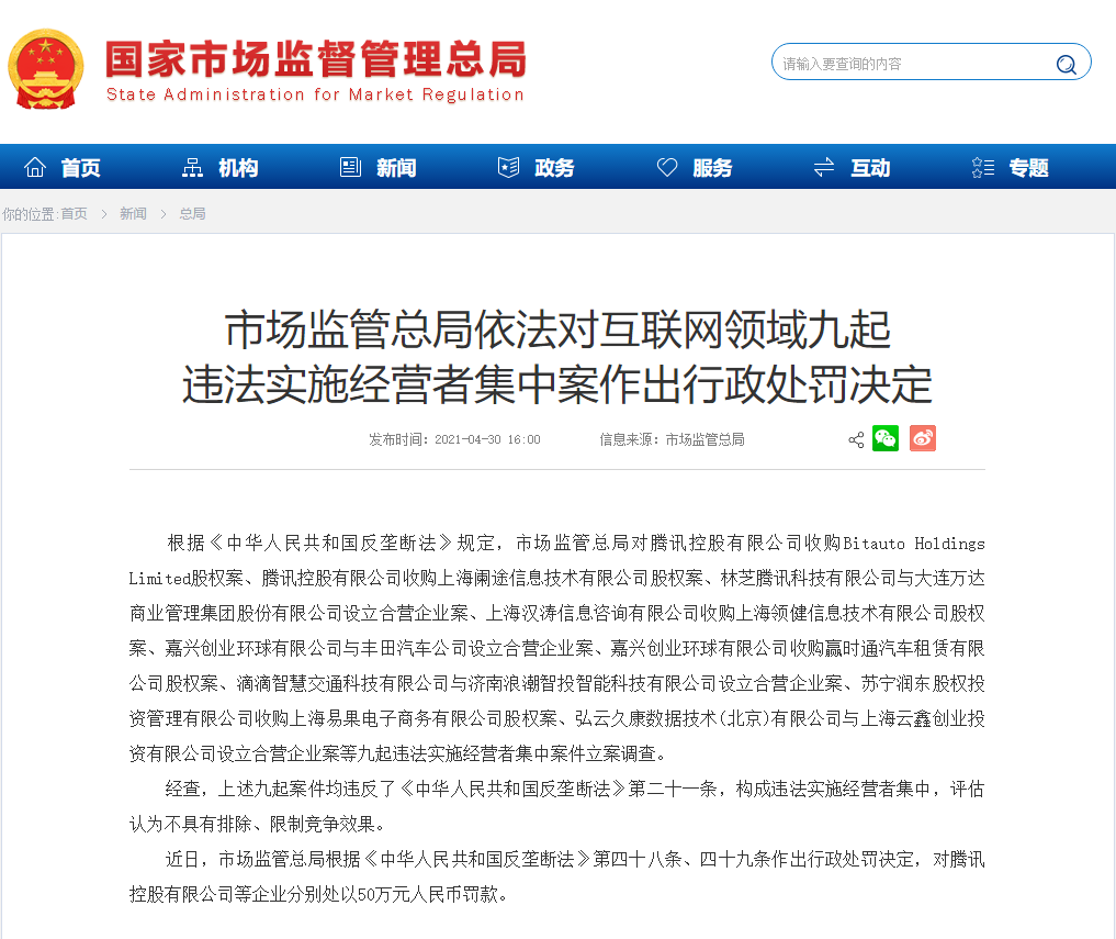 近日,市场监管总局根据《中华人民共和国反垄断法》第四十八条、四十九条作出行政处罚决定,对腾讯控股有限公司等企业分别处以50万元人民币罚款。