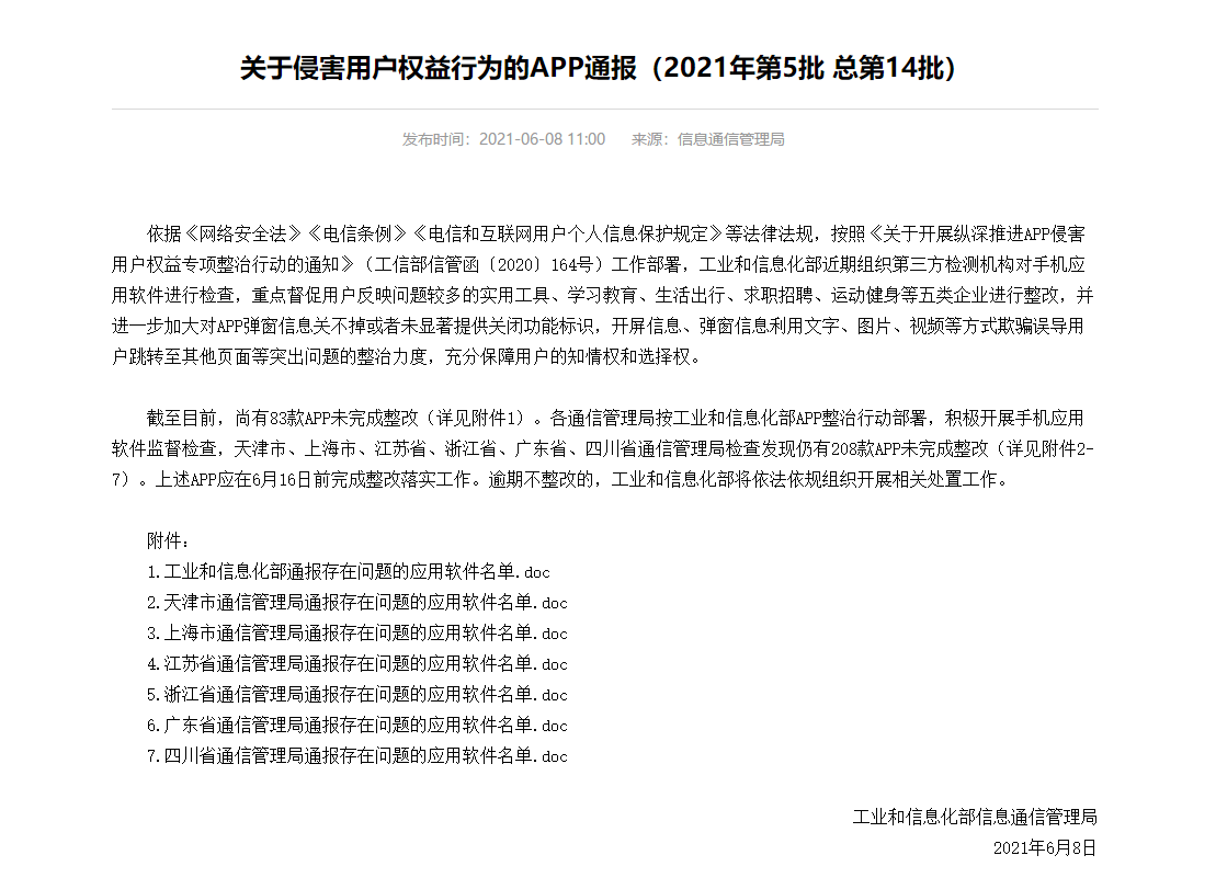 工信部8日消息,近期组织第三方检测机构对手机应用软件进行检查和督促整改,截至目前,尚有时光小屋等83款App未完成整改。天津市、上海市、江苏省、浙江省、广东省、四川省通信管理局检查发现仍有208款App未完成整改。工信部通报上述共计291款App,要求这些App在6月16日前完成整改,逾期不整改的,将依法依规组织开展相关处置工作。(记者张辛欣)