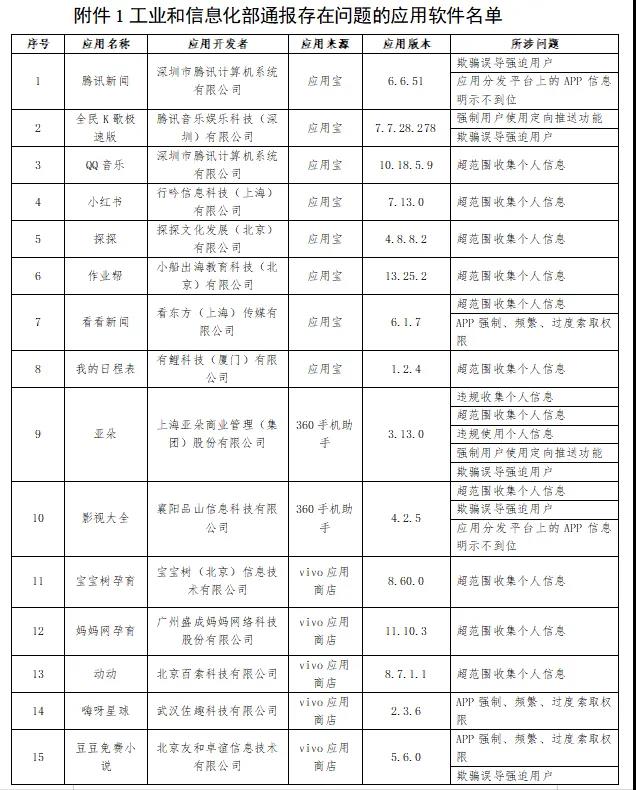 工业和信息化部通报存在问题的应用软件名单。部分名单截图