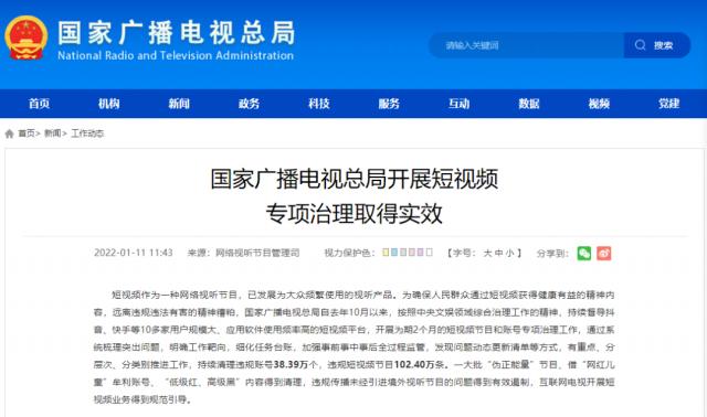 文中称,短视频作为一种网络视听节目,已发展为大众频繁使用的视听产品。国家广电总局自去年10月以来,按照中央文娱领域综合治理工作的精神,持续督导抖音、快手等10多家用户规模大、应用软件使用频率高的短视频平台,开展为期2个月的短视频节目和账号专项治理工作。