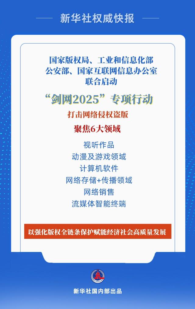 新华社北京5月16日电(记者 史竞男)国家版权局、工业和信息化部、公安部、国家互联网信息办公室四部门近日联合启动打击网络侵权盗版“剑网2025”专项行动,这是全国持续开展的第21次打击网络侵权盗版专项行动。