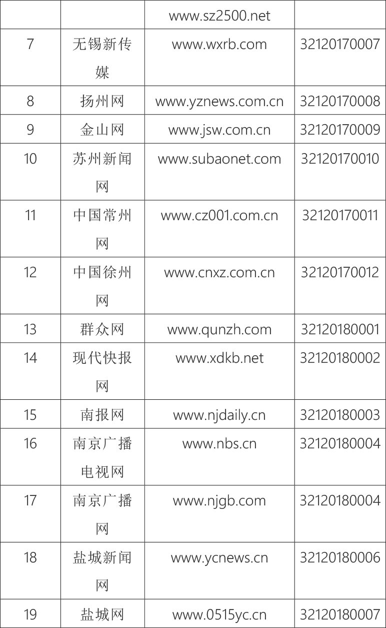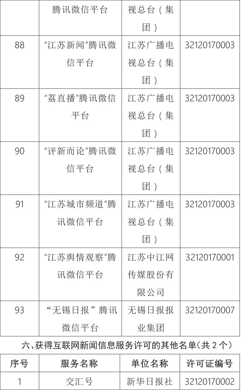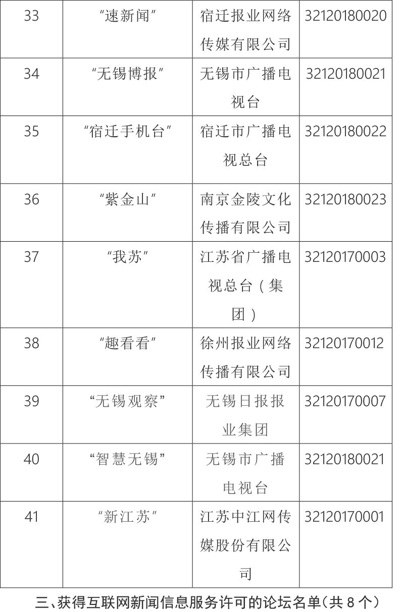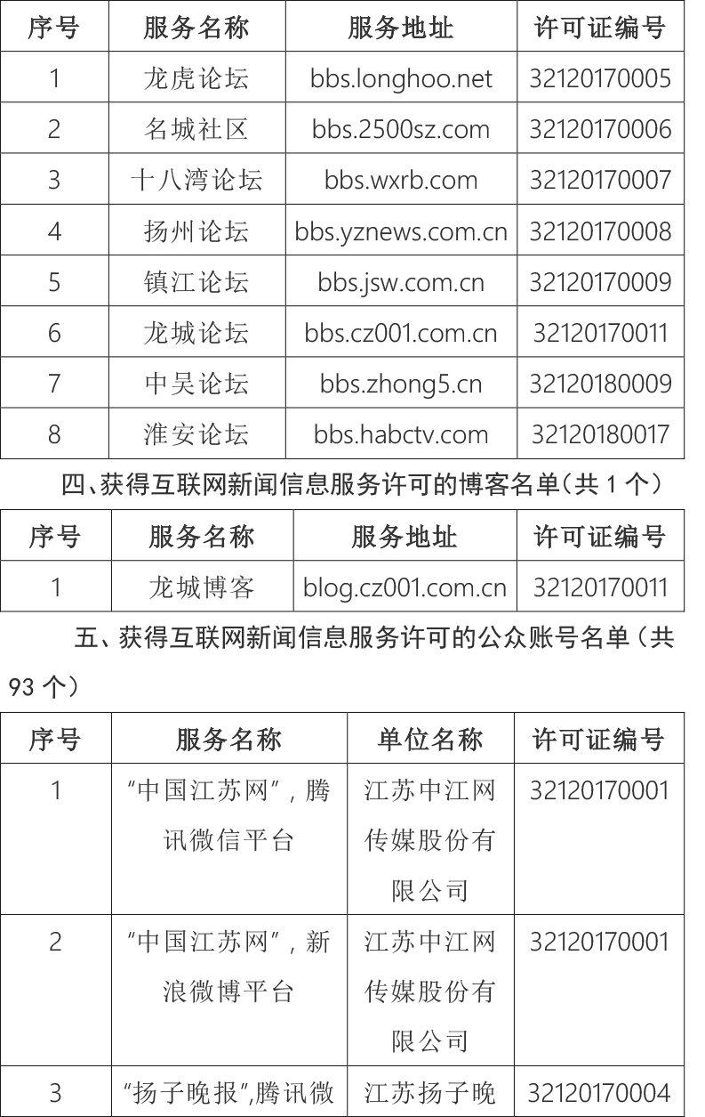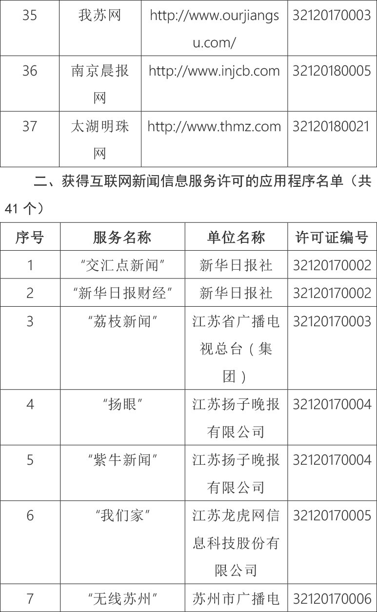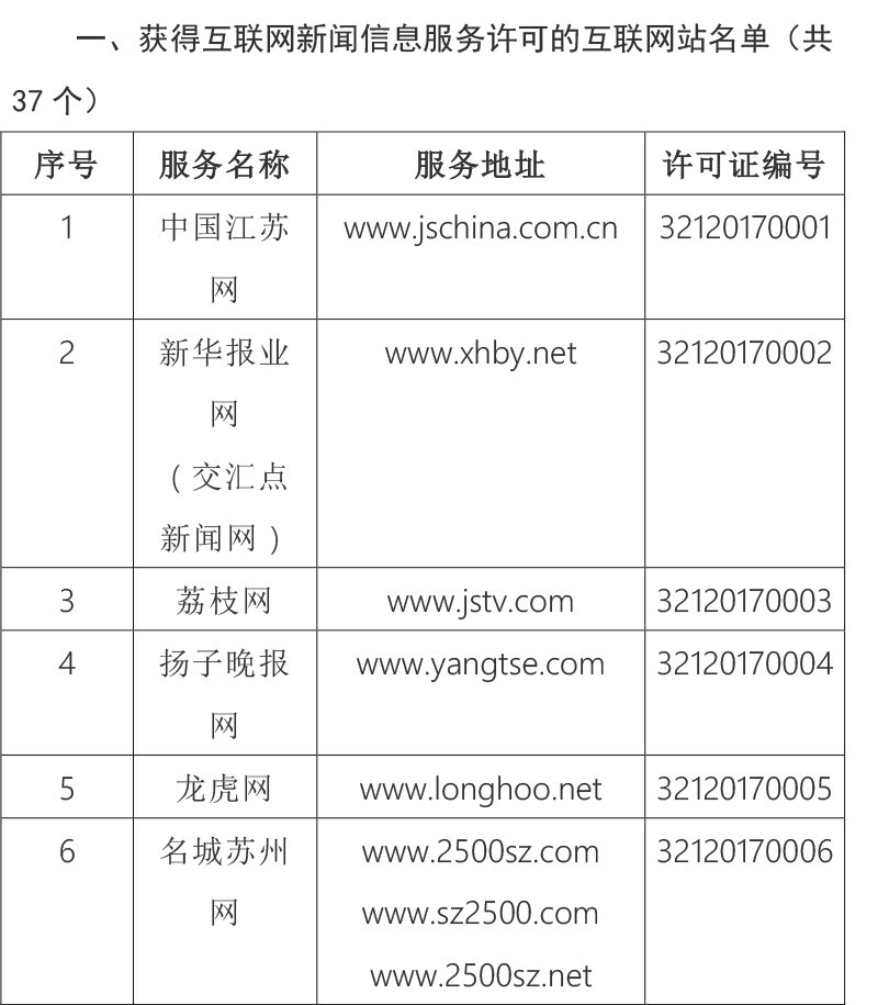 江苏省互联网信息办公室依法依规推进互联网新闻信息服务许可审批工作。截至目前,我省共有35家服务主体取得了互联网新闻信息服务许可证,现将互联网新闻信息服务单位相关许可信息予以公开,包括:互联网站37个,应用程序41个,论坛8个,博客1个,公众账号93个,其他2个,共计182个服务项。