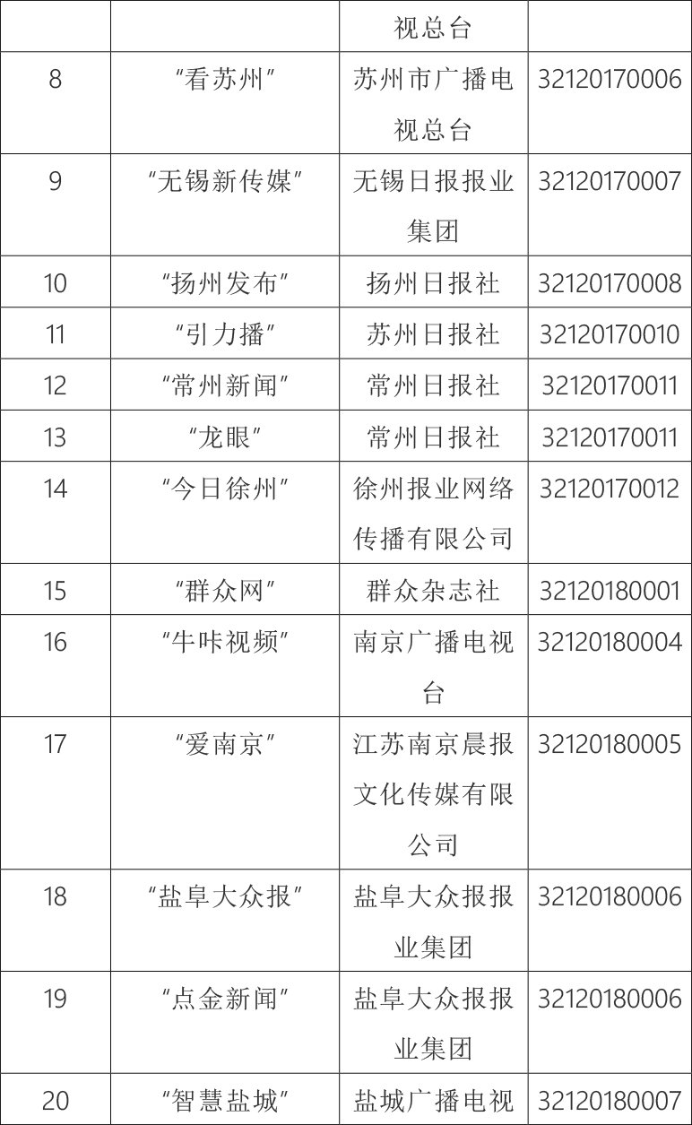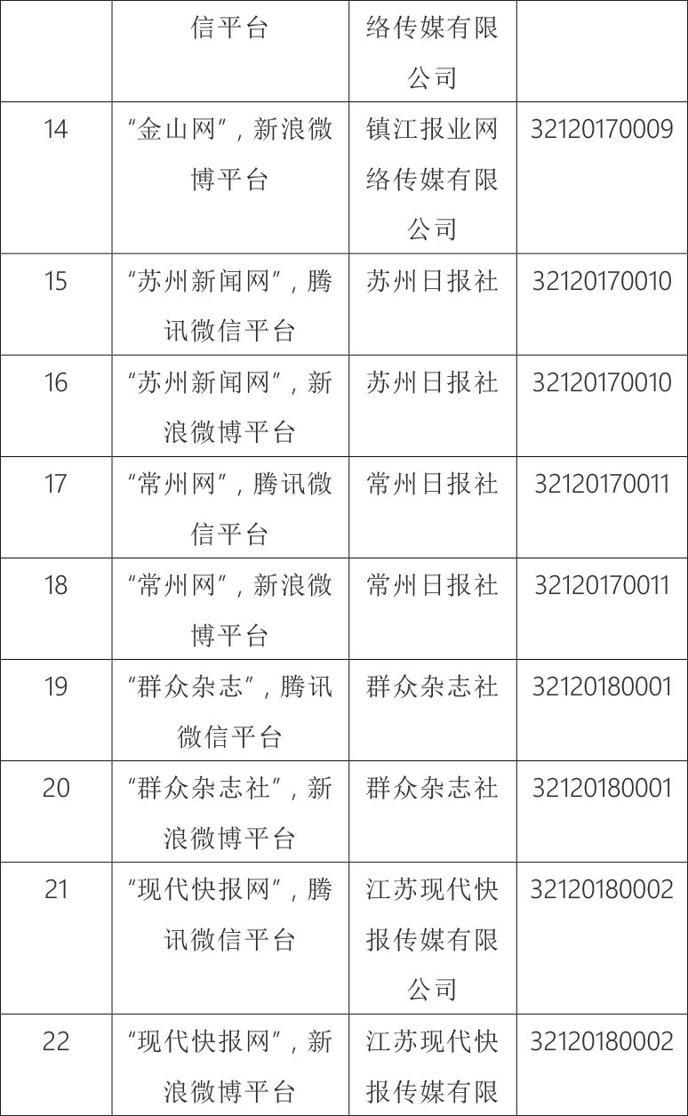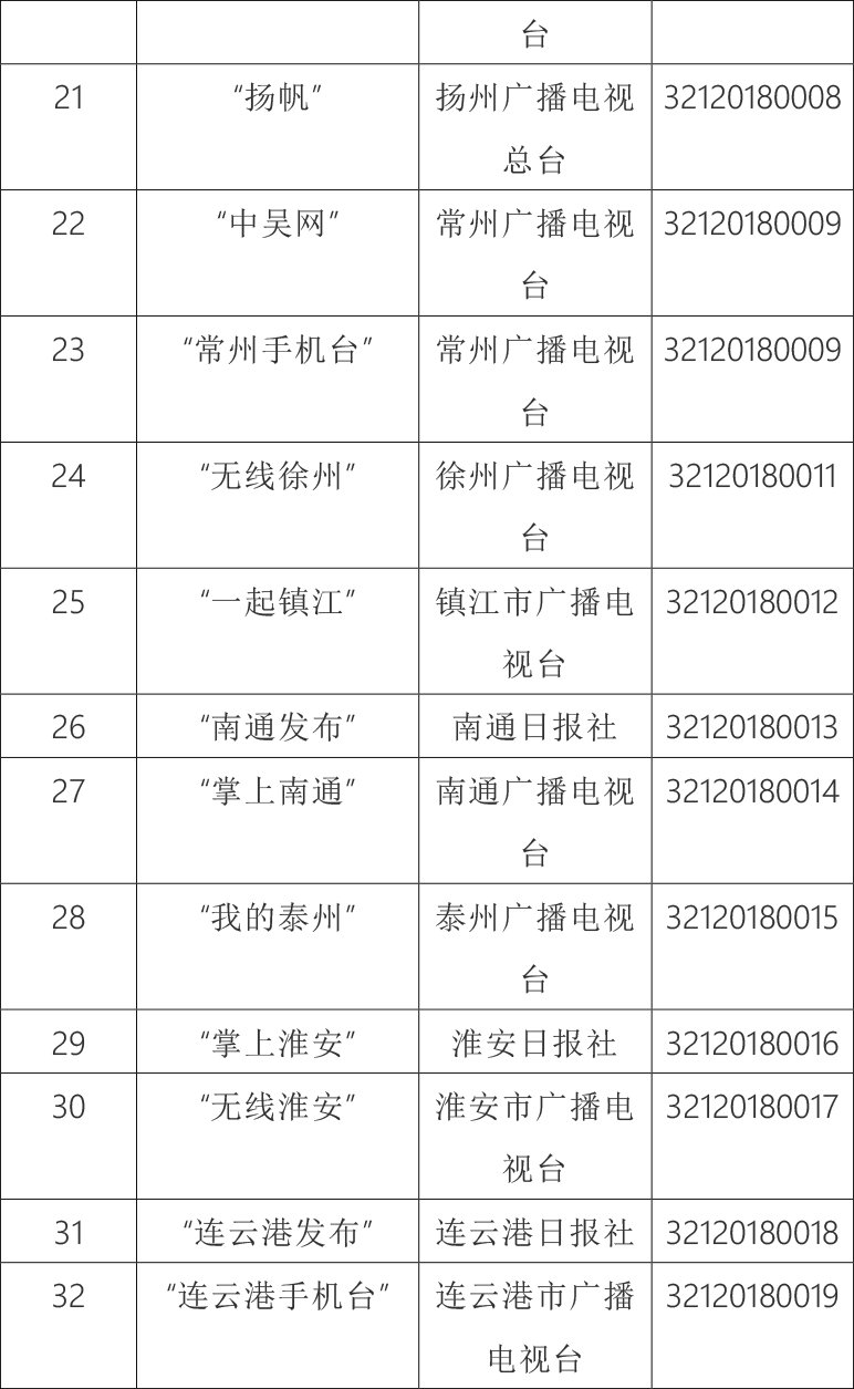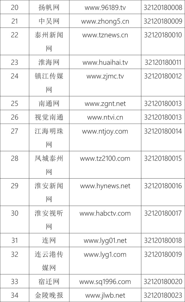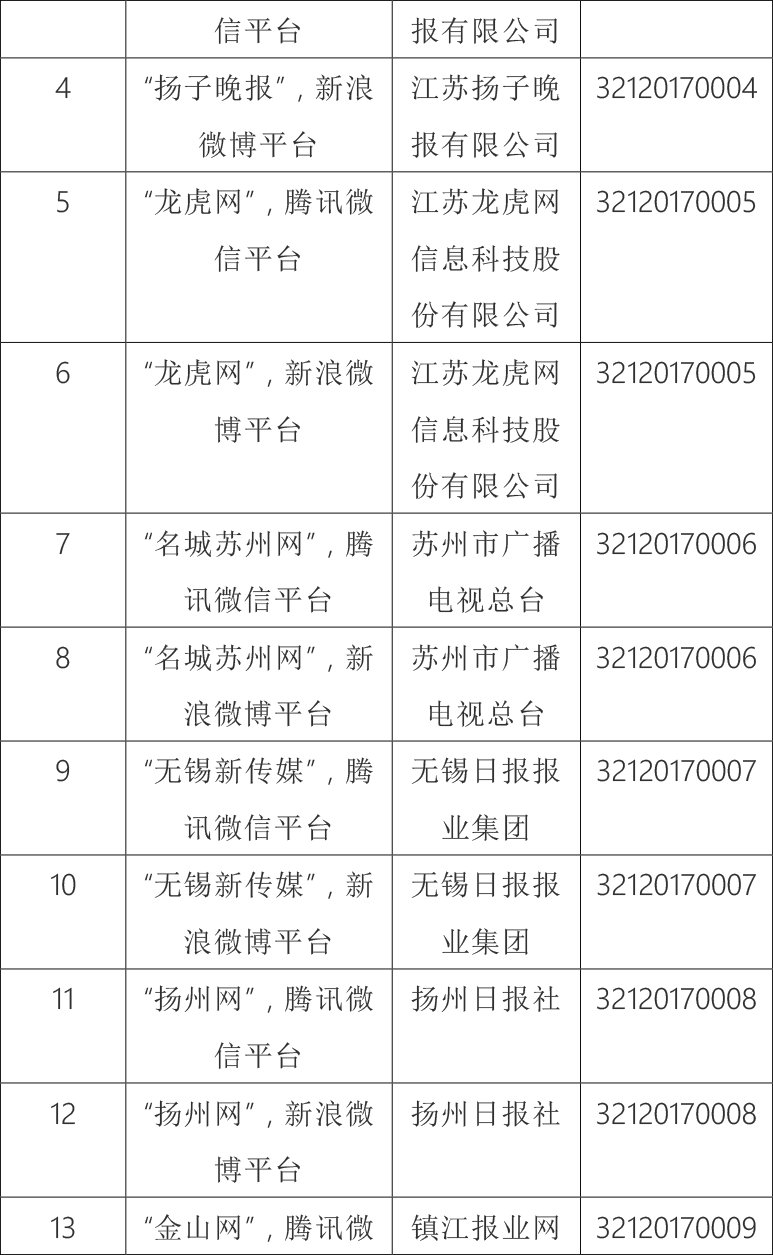 江苏省互联网信息办公室依法依规推进互联网新闻信息服务许可审批工作。截至目前,我省共有35家服务主体取得了互联网新闻信息服务许可证,现将互联网新闻信息服务单位相关许可信息予以公开,包括:互联网站37个,应用程序41个,论坛8个,博客1个,公众账号93个,其他2个,共计182个服务项。