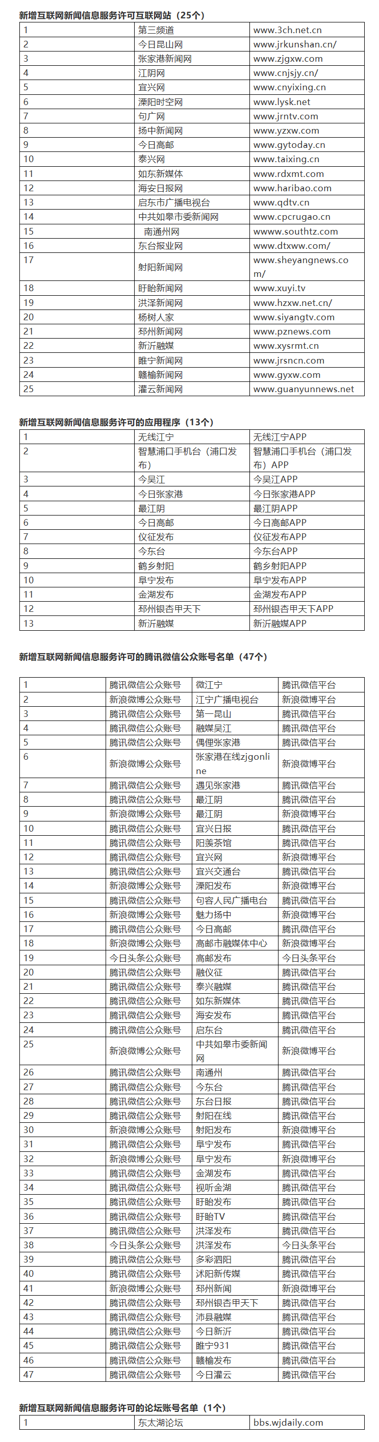 近日,江苏省互联网信息办公室依法批准32家县级融媒体中心互联网新闻信息服务单位许可。这32家分别是江宁区融媒体中心、浦口区融媒体中心、昆山市融媒体中心、吴江区融媒体中心、张家港市融媒体中心、江阴市融媒体中心、宜兴市融媒体中心、溧阳市融媒体中心、句容市融媒体中心、扬中市融媒体中心、高邮市融媒体中心、仪征市融媒体中心、泰兴市融媒体中心、如东县融媒体中心、海安市融媒体中心、启东市融媒体中心、如皋市融媒体中心、通州区融媒体中心、东台市融媒体中心、射阳县融媒体中心、阜宁县融媒体中心、金湖县融媒体中心、盱眙县融媒体中心、洪泽区融媒体中心、泗阳县融媒体中心、沭阳县融媒体中心、邳州市融媒体中心、沛县融媒体中心、新沂市融媒体中心、睢宁县融媒体中心、赣榆区融媒体中心、灌云县融媒体中心 。新增服务形式包括:互联网站25个,应用程序13个,公众账号47个、论坛1个,共计86个服务项。