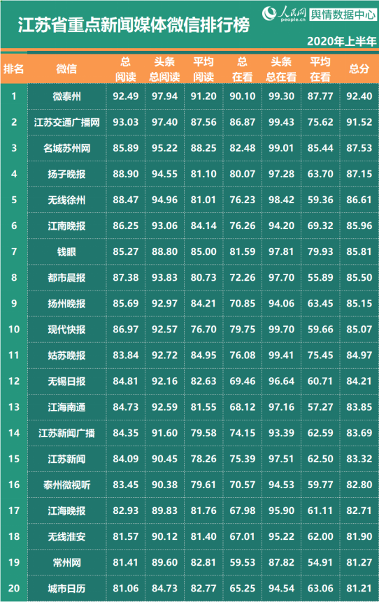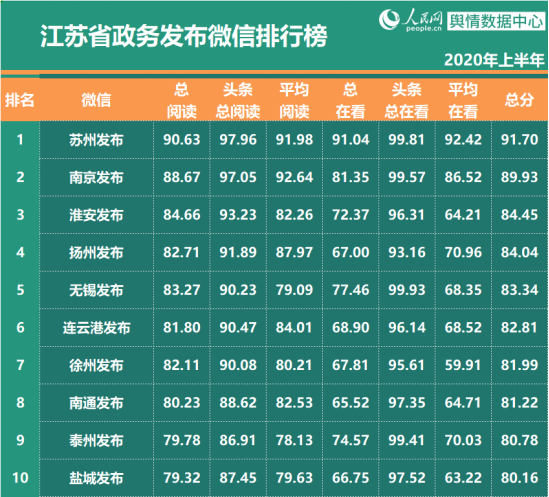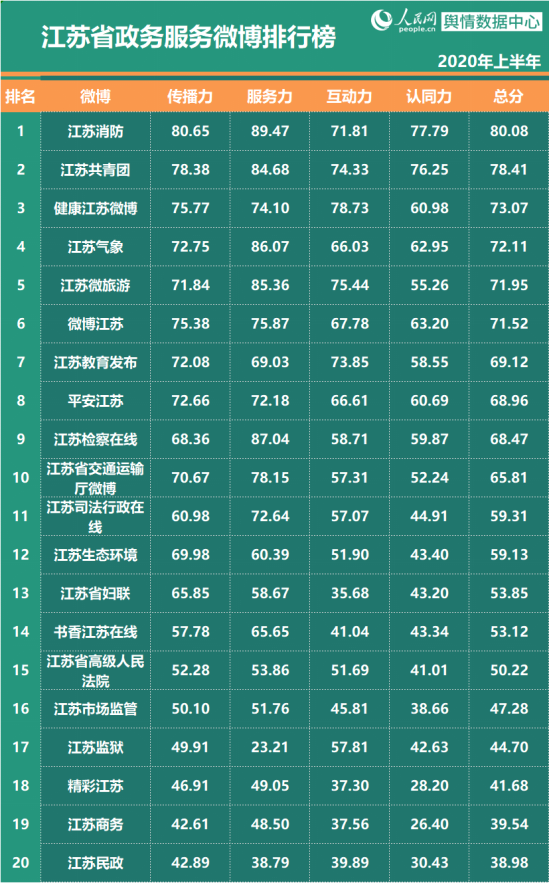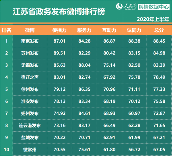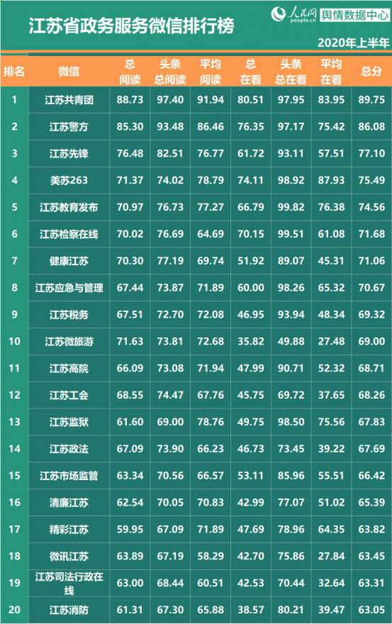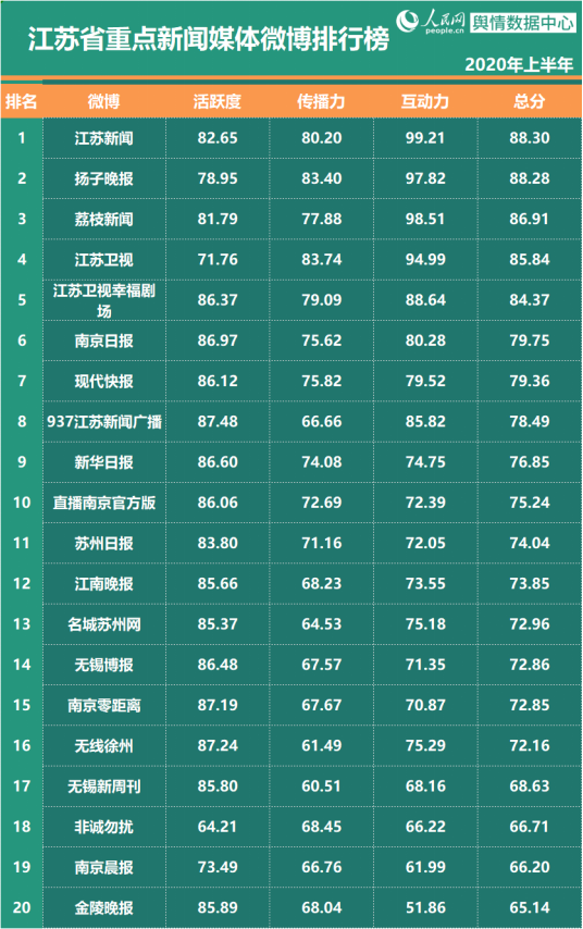2020年8月,江苏省委网信办与人民网舆情数据中心联合推出“2020年上半年江苏省政务和重点新闻媒体微博微信排行榜”。