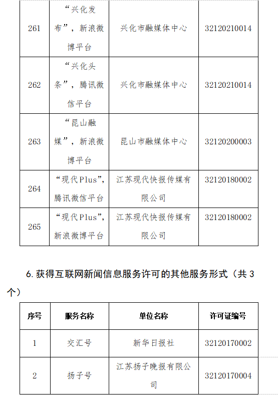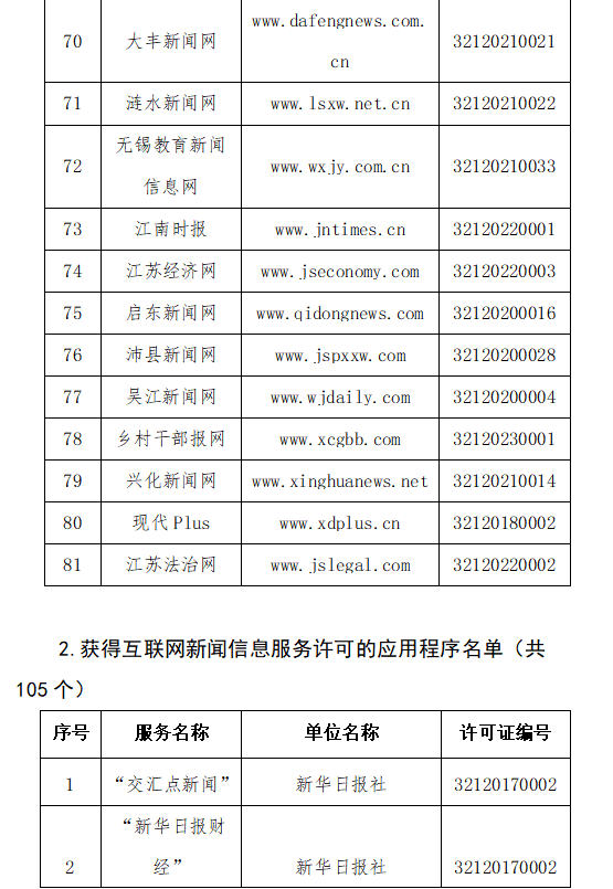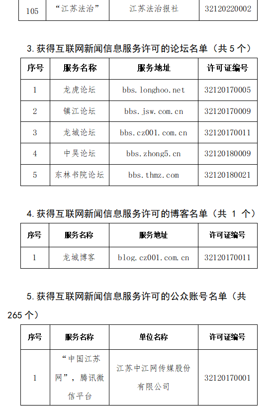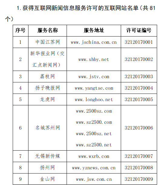 江苏省互联网信息办公室依法依规推进互联网新闻信息服务许可审批工作。截至目前,我省共有104家服务主体取得了互联网新闻信息服务许可证,具体服务形式包括:互联网站81个,应用程序105个,论坛5个,博客1个,公众账号265个,其他服务形式3个,共计460个服务项。