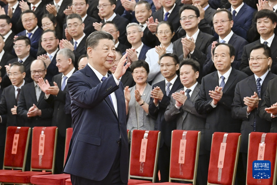9月23日,党和国家领导人习近平、李强、赵乐际、王沪宁、蔡奇、丁薛祥、李希等在人民大会堂接见探月工程嫦娥六号任务参研参试人员代表并参观月球样品和探月工程成果展览。这是习近平发表重要讲话。