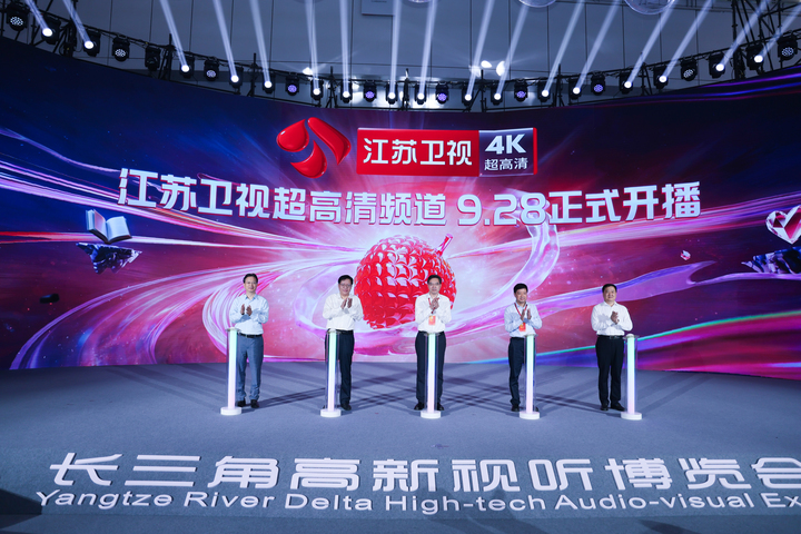 江苏省委副秘书长仲红岩、省委宣传部副部长张笑、省广电局局长曹远剑、省广电总台台长葛莱、省广电网络公司董事长庄传伟共同启动江苏卫视超高清频道上线