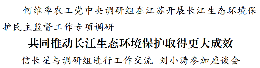 信长星感谢农工党中央长期以来对江苏发展的关心支持、对全省生态环境保护工作的监督指导。他说,江苏深入践行习近平生态文明思想,认真落实习近平总书记关于推动长江经济带高质量发展和对江苏工作重要讲话精神,坚持共抓大保护、不搞大开发,持续抓好标本兼治、系统治理,协同推进自然恢复、人工修复,不断改善长江生态环境,切实守护好“一江清水”、保护好“母亲河”。我们将落实好调研组提出的意见建议,久久为功推动长江生态环境保护取得更大成效,奋力在落实国家重大发展战略上走在前。