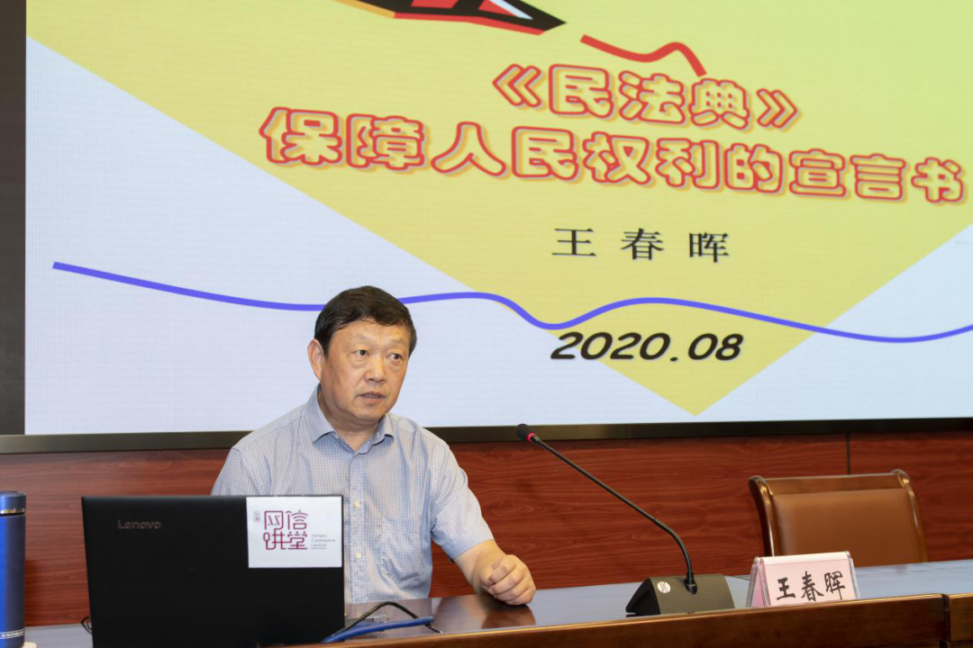 为深入贯彻落实习近平总书记关于学习宣传民法典的重要讲话精神,充分认识颁布实施民法典重大意义,依法更好保障人民合法权益,8月13日下午,省委网信办举行“江苏网信讲堂——《民法典》”专题报告会,邀请中国通信学会网络空间安全与法律委员会副主任、南京邮电大学教授、博士生导师王春晖围绕“《民法典》——保障人民权利的宣言书”作专题辅导讲座。
