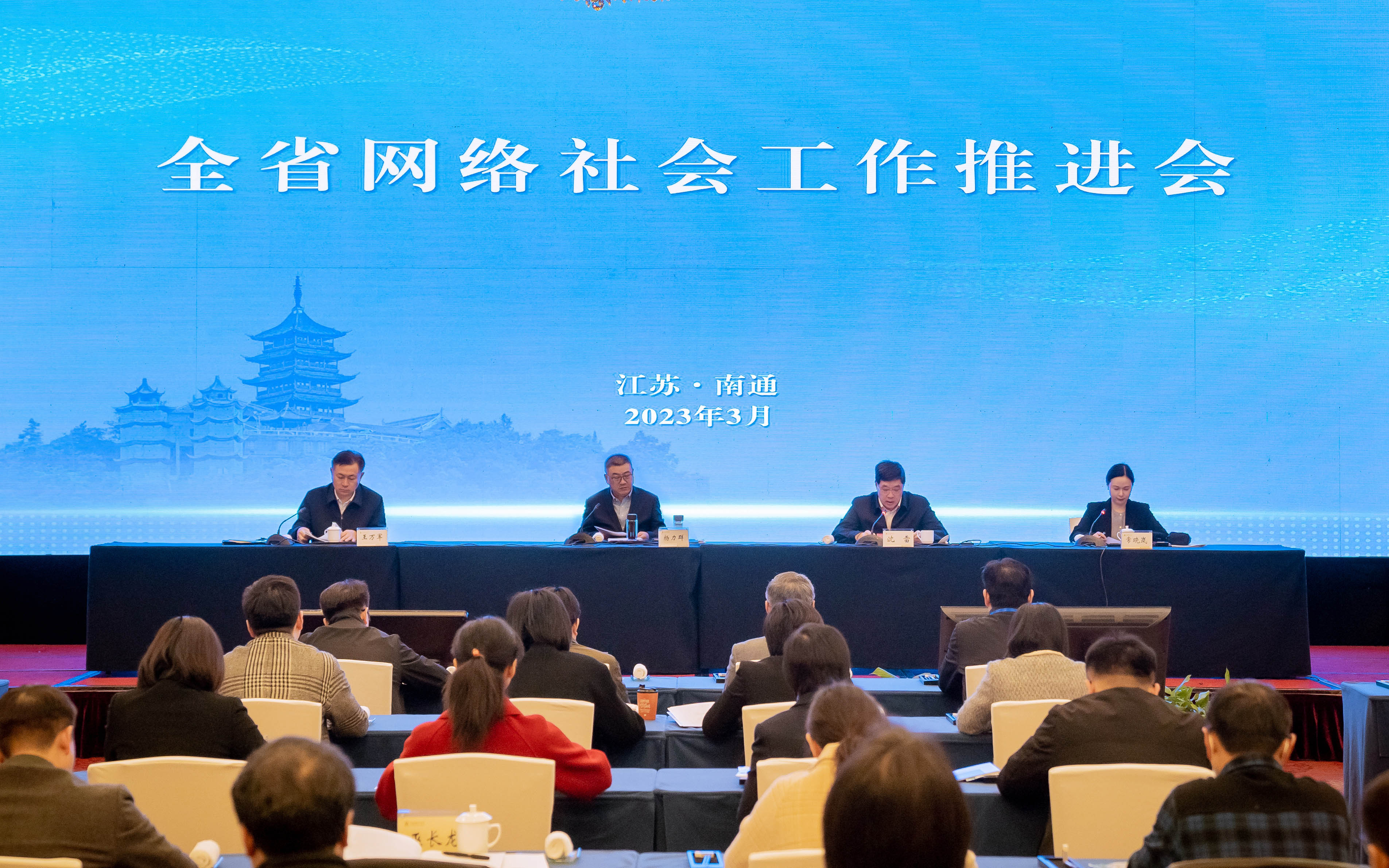 3月22日,全省网络社会工作推进会在南通市召开。省委宣传部副部长、省委网信办主任杨力群出席会议并讲话,省委网信办副主任王万军,南通市委副书记、宣传部部长沈雷以及各设区市市委网信办主要负责同志、部分县(市、区)委网信办负责同志参加会议。