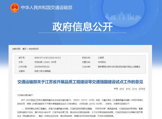 近日,交通运输部批复江苏交通强国建设试点工作重点 ,原则同意在品质工程建设、多层次轨道网融合发展、打造新亚欧陆海联运通道、“四好农村路”高质量发展、打造枢纽经济新格局、智慧交通关键技术攻关、提升科技兴安水平、打造平安交通工程、推动综合交通改革创新、长江经济带运输结构调整、打造运河绿色文化带等方面开展试点。