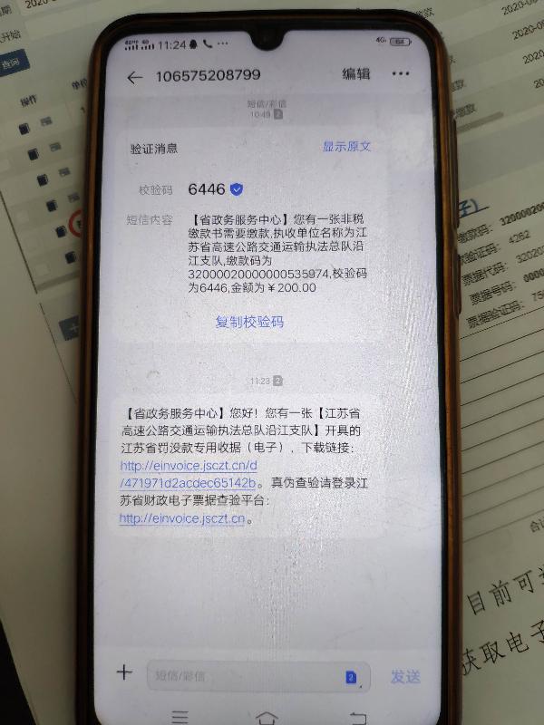 在大队交通行政执法人员的引导下,当事人通过手机接收到的短信网址登录江苏省财政电子票据查验平台,顺利获取一张电子罚没款票据。
