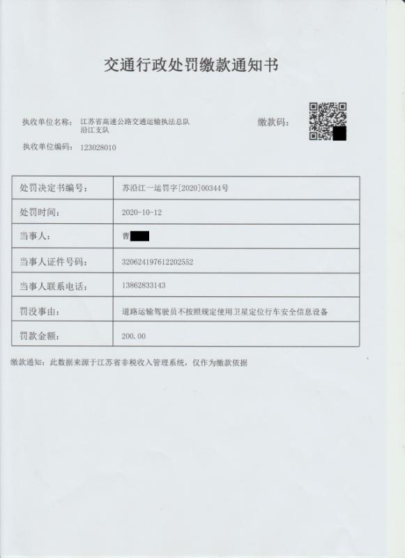 10月12日上午,曹某违反《江苏省道路运输条例》第二十一条规定“道路运输驾驶员不按照规定使用卫星定位行车安全信息设备”,在沿江支队第一大队执法服务中心通过微信扫码的方式,成功缴纳行政处罚款。