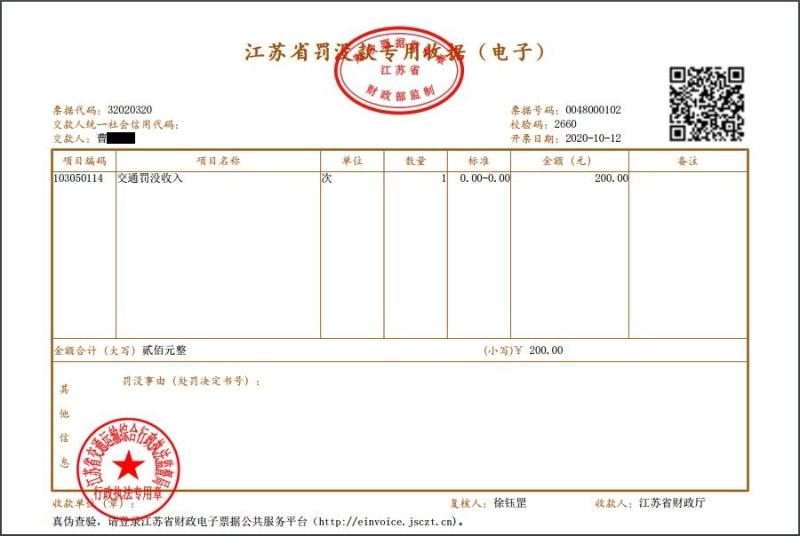 电子票据相对传统的纸质票据更快速,提高了工作效率,减少当事人等待时间。通过系统产生一张载有违法当事人相关信息、罚款金额和二维码的缴款通知书,只需要用手机“扫一扫”,违法当事人成功缴纳行政处罚罚没款后,就能读取电子票据,可自行下载、打印票据、查验电子票据。
