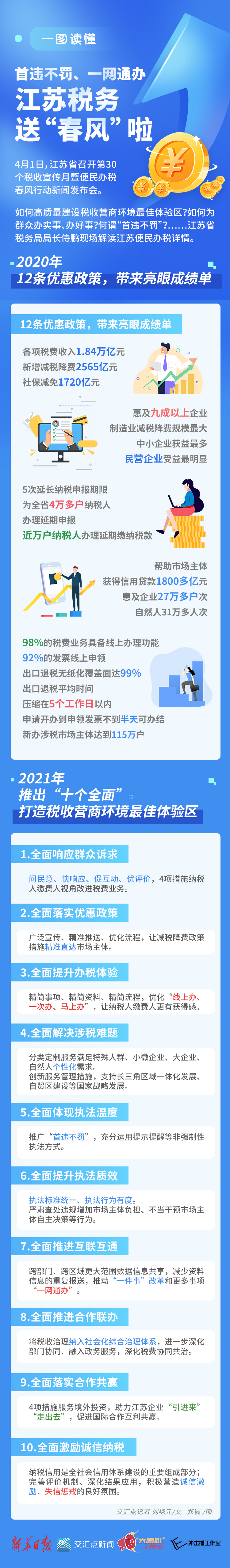 4月1日,江苏省召开“第30个税收宣传月暨便民办税春风行动”新闻发布会。如何高质量建设税收营商环境最佳体验区?如何为群众办实事、办好事?何谓“首违不罚”?……江苏省税务局局长侍鹏现场解读江苏便民办税详情。