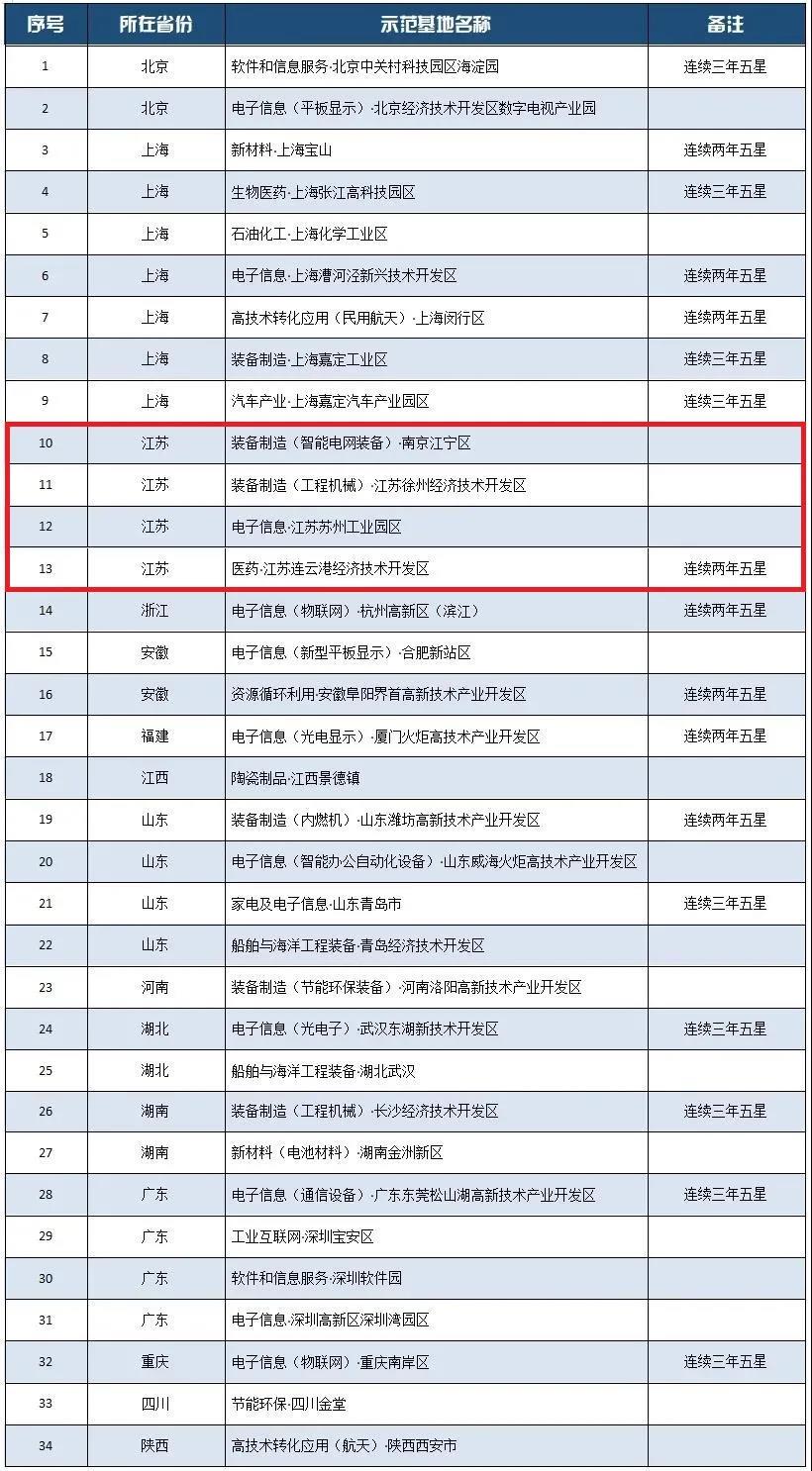 此次江苏的南京市江宁区装备制造(智能电网装备)、徐州经济开发区装备制造(工程机械)、苏州工业园区电子信息、连云港经济技术开发区医药等4家示范基地获评2020年五星示范基地,数量仅次于上海,与山东、广东并列第二。其中,连云港经济技术开发区医药示范基地是我省唯一一家连续两年获评五星的示范基地。