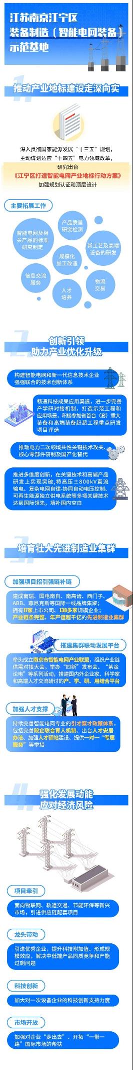 作为先进代表,五星示范基地发展成效突出,产业实力雄厚。以南京市江宁区装备制造(智能电网装备)示范基地为例,基地内培育壮大先进制造业集群,南瑞、国电南自、西门子、ABB等国际一线集群,拥有17家上市公司、130多家规模企业,形成产业链条完整、年产值超千亿元的先进制造业集群。