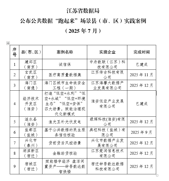 作为数据大省,江苏又如何在推动公共数据“跑起来”方面走在前作示范?经企业自主申报、各地推荐与综合评估,按照每个县(市、区)一次最多入选一个的要求,省数据局公布了首批公共数据“跑起来”场景县(市、区)实践案例名单(2025年7月),覆盖了诚信保、医疗高质量数据集、城市生命线安全工程、低空+水利等众多领域。