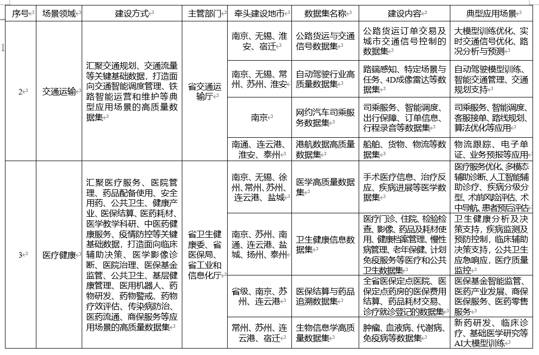 据悉,首批建设清单的发布,有望加速推动江苏相关重点领域高质量数据集的开放、共享、流通,赋能交通、医疗、教育等行业大模型,工业、农业、政务等领域大模型训练和应用,赋能江苏经济社会高质量发展。