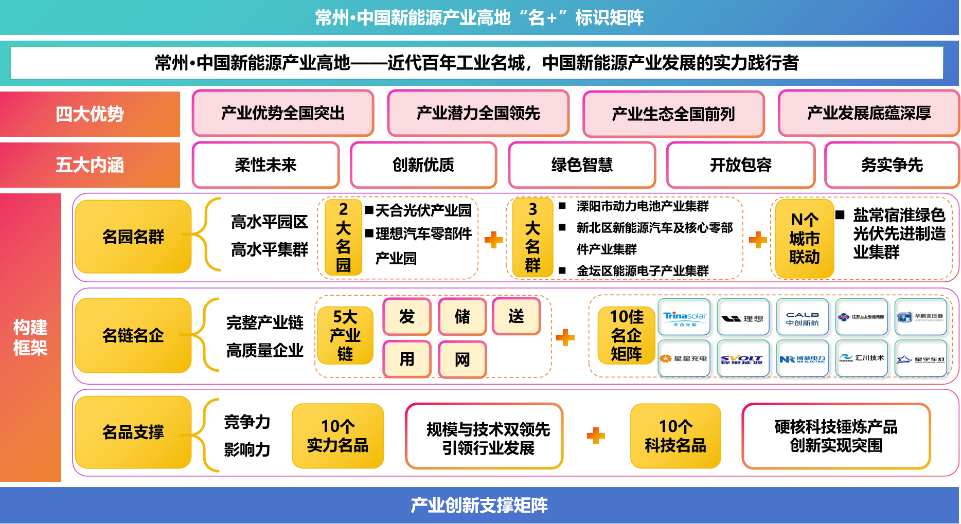 “名+”矩阵是支撑产业名片建设的基础性、系统性工程,涵盖名园名群、名企名品、名家名匠维度,并可延伸至更多领域,能反映企业经营情况、产业规模实力、领域智力支撑等。按照区域(城市)产业名片理论体系,“名+”矩阵是组成城市产业名片竞争力的核心,也是建设提升城市产业名片影响力和美誉度的关键。《常州·中国新能源产业高地“名+”矩阵报告》通过系统化的遴选标准和评估方法,全面构建常州在全国乃至全球的“名+”标识矩阵,助力引导新能源领域各优质要素向常州集聚,展示提升常州新能源产业的核心竞争力和影响力,着力打造常州·中国新能源产业高地2.0深化版,为建设具有全球影响力的新能源产业高地提供战略支撑。