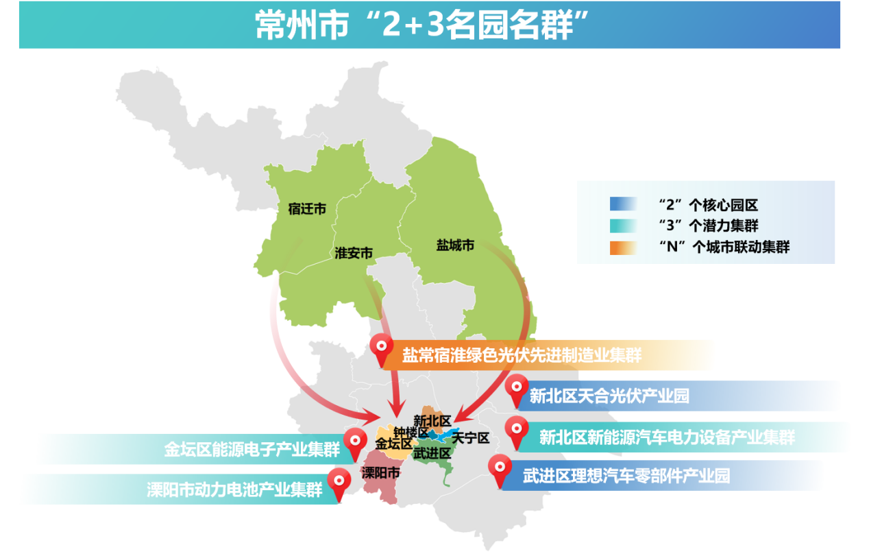 此次报告发布的常州“2+3”名园名群包括“新北区天合光伏产业园”和“武进区理想汽车零部件产业园”两个地标名园、“金坛区能源电子产业集群”“溧阳市动力电池产业集群”“新北区新能源汽车电气设备产业集群”3个特色名群。对标国际国内先进新能源园区和集群,它们在产业规模和集聚度、产业链条的完整度和协同性维度具备较强优势。“盐常宿淮绿色光伏先进制造业集群”构建起一套完整的光伏产业链体系,总产值占全国比重超1/5,是国家先进制造业集群,同样表现亮眼。
