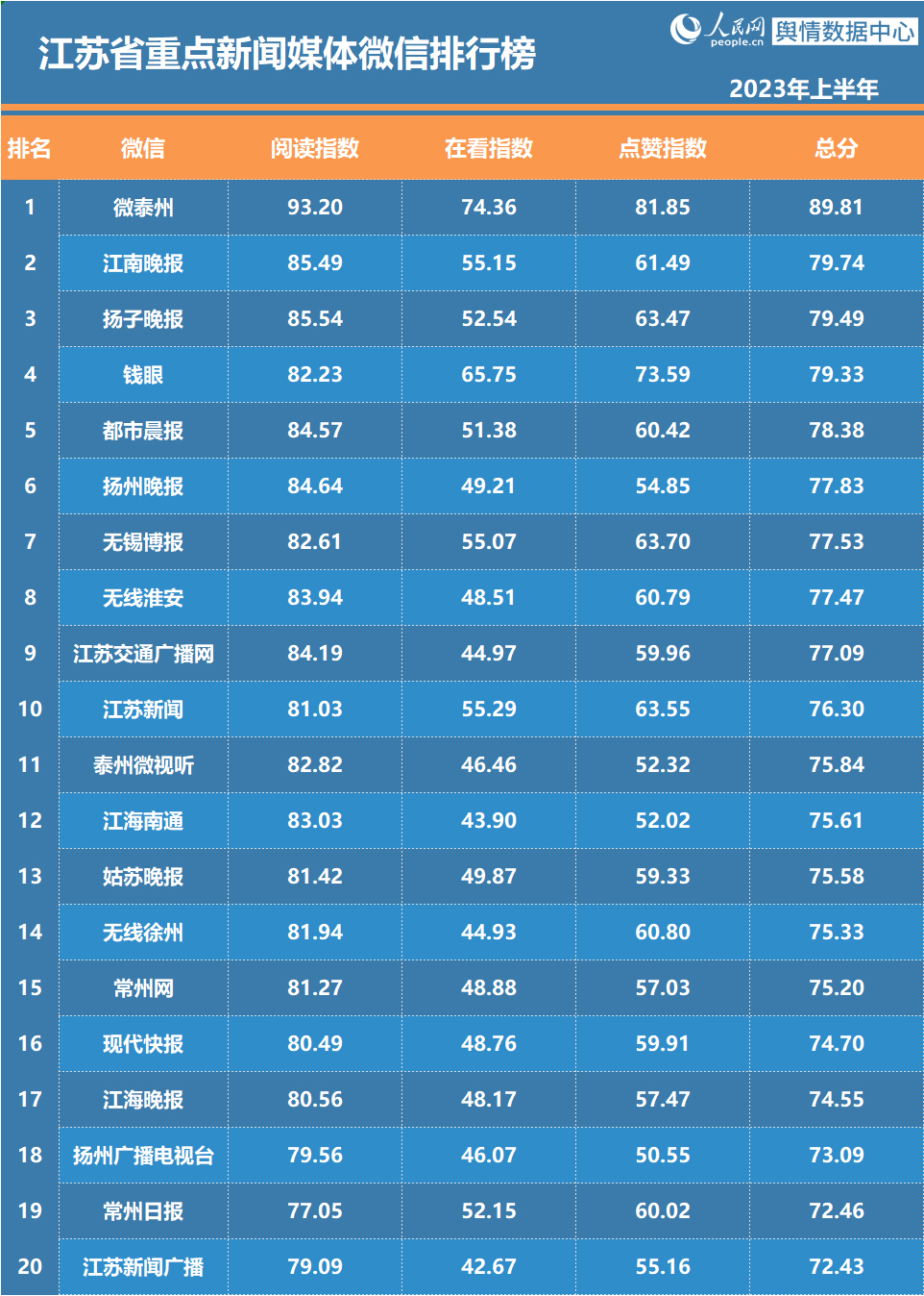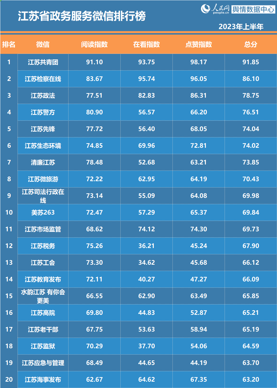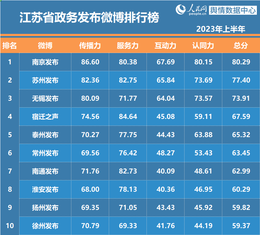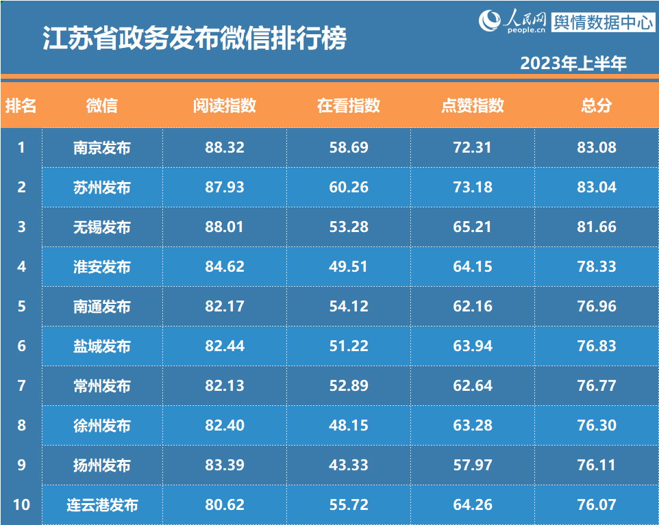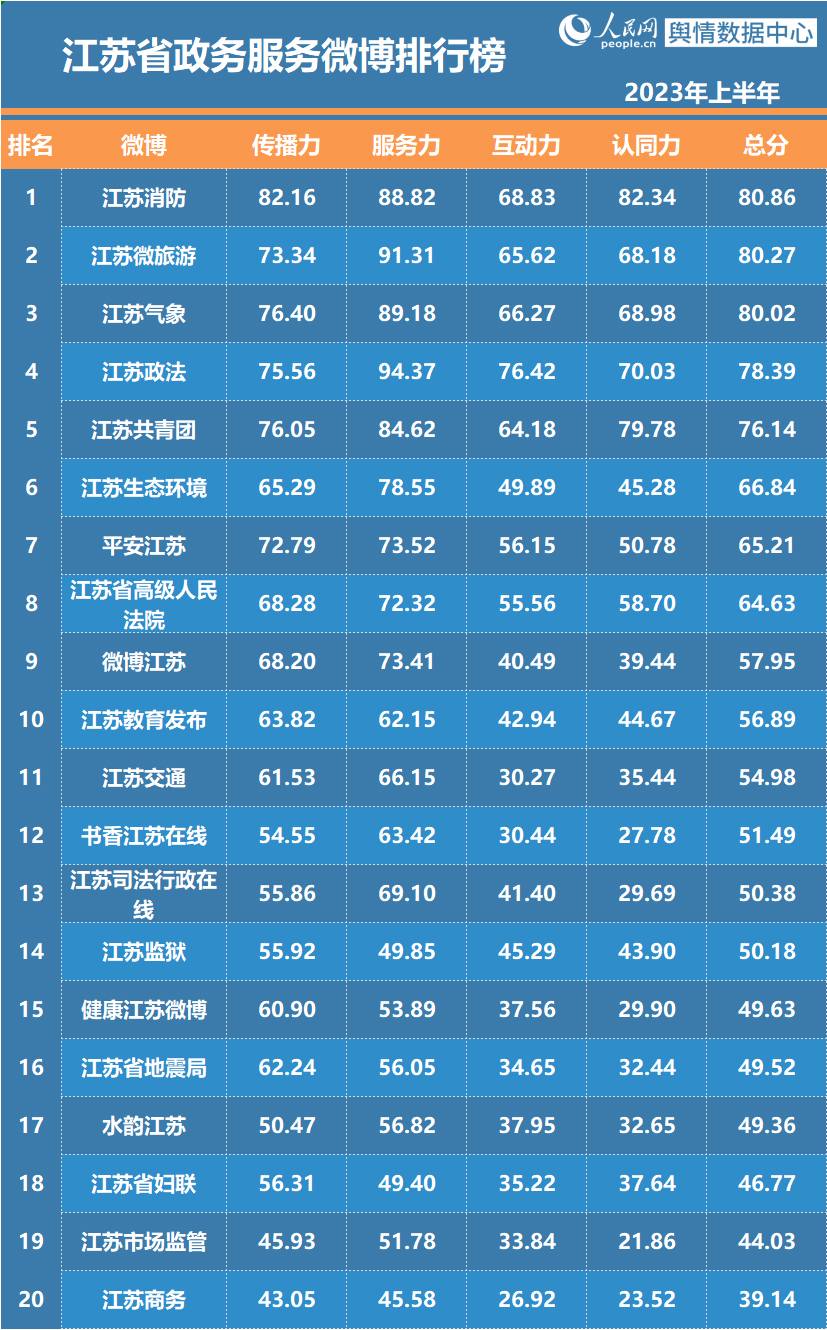近日,江苏省委网信办与人民网舆情数据中心联合推出“2023年上半年江苏省政务和重点新闻媒体微博微信排行榜”。南京发布摘得政务发布微博、微信排行榜双冠军;@江苏消防、“江苏共青团”分获政务服务微博、微信排行榜冠军;省重点新闻媒体微博、微信排行榜冠军分别由@江苏卫视、“微泰州”获得。