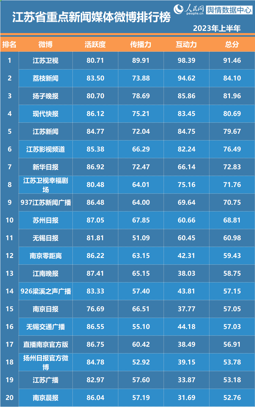 上半年,@江苏卫视以总分91.46的好成绩荣获重点新闻媒体微博排行榜第一,@荔枝新闻、@扬子晚报获得第二和第三,@现代快报、@江苏新闻入围前五。省重点新闻媒体微博帖文中,转评赞互动量超5万次的有70余篇,其中@江苏卫视发布的占比超过半数,达63.5%,如“江苏卫视2023兔年春晚节目单来啦”等10篇帖文的转评赞超10万次。@荔枝新闻、@现代快报、@扬子晚报发布的有关劳动关系、招聘大熊猫饲养员等近20篇帖文的转评赞达5万次以上。