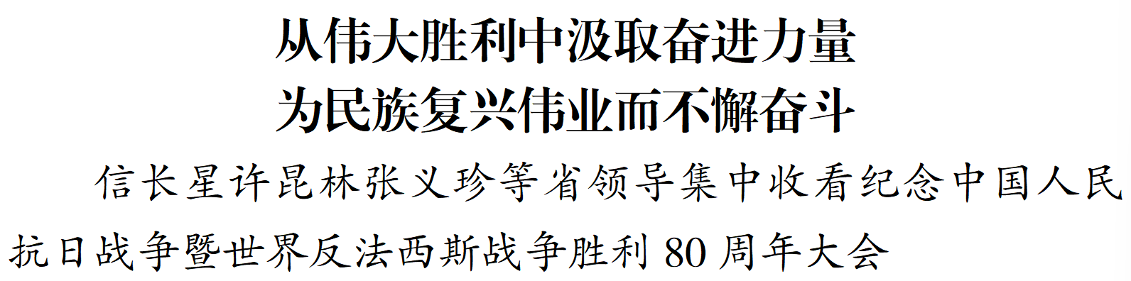 铭记历史、缅怀先烈、珍爱和平、开创未来。9月3日上午,纪念中国人民抗日战争暨世界反法西斯战争胜利80周年大会在北京天安门广场隆重举行,中共中央总书记、国家主席、中央军委主席习近平发表重要讲话并检阅受阅部队。省委书记信长星、省长许昆林、省政协主席张义珍等省领导集中收看纪念大会。
