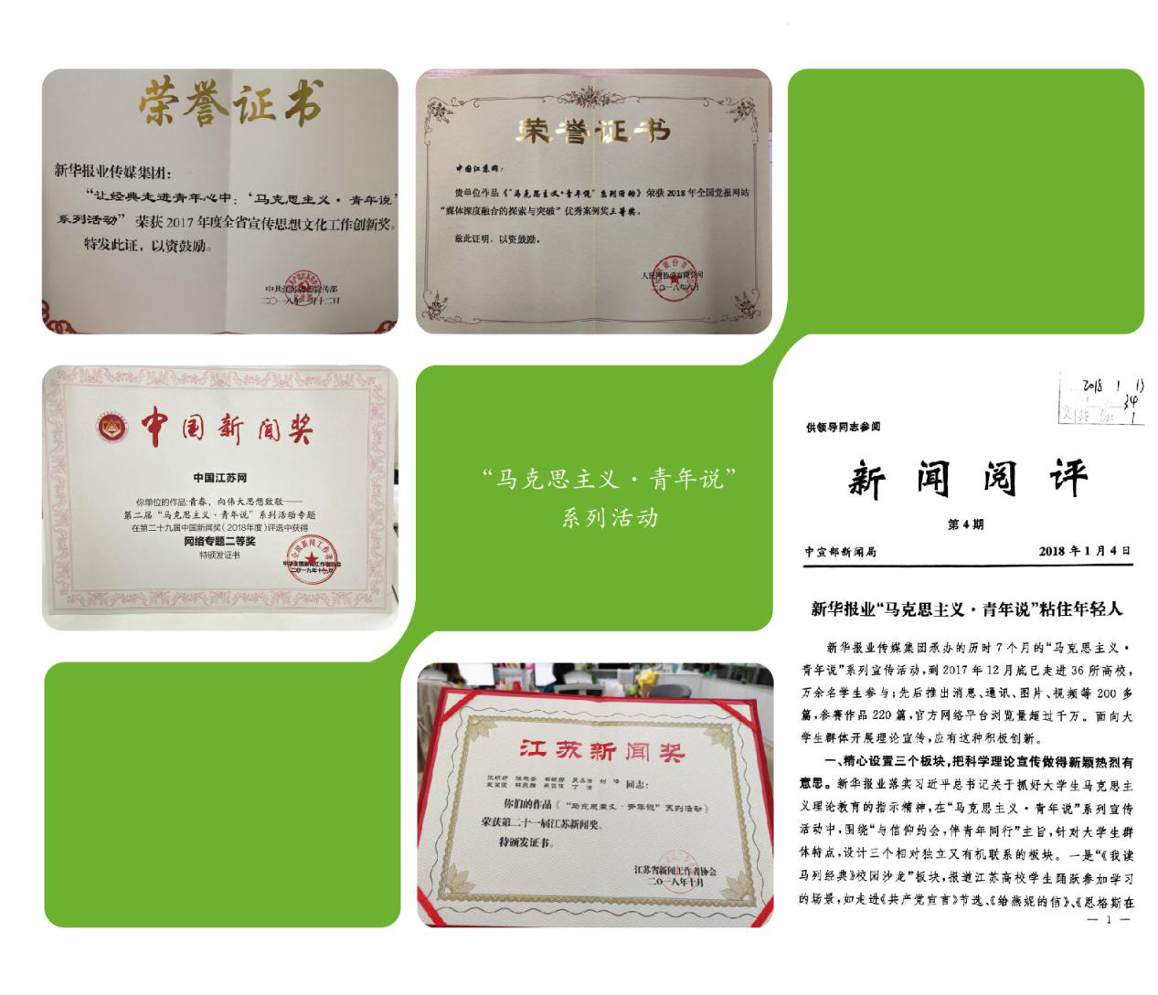 “马克思主义青年说”系列活动作为全省乃至全国理论宣传创新的一个品牌,经过三年的创新推进,入选人民网评出的“媒体深度融合探索与突破”优秀案例奖。中宣部、教育部给予充分肯定;江苏省委书记娄勤俭在《求是》杂志撰文中,明确要求全省高校“深化拓展‘马克思主义青年说’系列活动”。2019年2月1日,娄勤俭书记在新华报业传媒集团慰问调研时再次对活动表示肯定。11月8日,《青春向伟大思想致敬——第二届“马克思主义青年说”系列活动》专题获中国新闻奖二等奖。