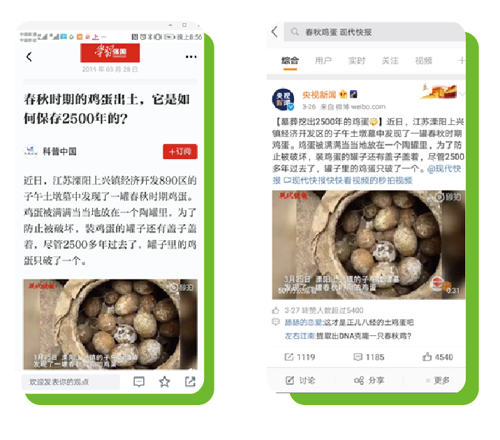 据不完全统计,2019年,“江苏文脉”公众号的文章通过各平台分发,全网总阅读量超过2.3亿次,多篇文章成为网络爆款,各大网络平台纷纷转载。例如《82年的拉菲算什么,老板,来盘春秋时的炒鸡蛋!》一文配以短视频,被各大终端转载,一度刷屏,“学习强国”里的科普中国选用并推荐到首屏;央视新闻微博转发,不到1分钟的短视频仅在秒拍一个平台的点击率就超过了500万次。单篇全网阅读量超过3000万次。