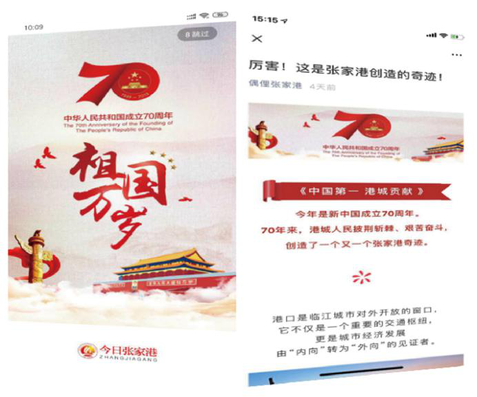 2.融合传播、媒体联动,细分受众、差异表达。“偶俚张家港”“遇见张家港”等媒体微信平台同步开设“壮丽70年奋斗新时代”栏目,推出系列报道《新中国成立七十周年成就性报道》《中国第一 港城贡献》《我和共和国同岁》《庆国庆忆峥嵘》等,发布全市上下喜迎国庆、“与祖国同框”、我市“庆祝中华人民共和国成立70周年”纪念章颁发等重要内容。“张家港城事”“张家港市人民政府网”“文明张家港”等市级政务微信平台同步开设了《我和我的祖国网络拉歌赛》专栏,激发了各镇区祝福祖国的高潮,策划《我的国我的家》系列报道,聚焦我市不同领域的特定人物,讲述他们的追梦故事。并推送了“看大桥风采,为祖国喝彩”沪通铁路张家港长江大桥开放日活动,全方位报道了我市干部群众的喜悦之情和热烈反响。