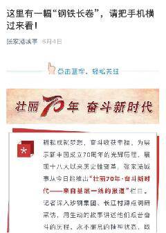 系列报道中,创新运用了长图、手绘H5、视频、动图等丰富多彩的展现形式,与文字搭配,取得了特别的传播效果。比如,《这里有一幅“钢铁长卷”,请把手机横过来看!》以沙钢重要发展节点的图文为素材,用横版长的形式展现沙钢集团近70年来从弱到强的成长史。横版长图的形式更易于手机浏览,视觉效果更震撼、直观。《“壮丽70年”记者蹲点调研:这个张家港人的“家”很大》以80后沙钢工人史婧琦为对象,拍摄了一个1分29秒的短视频,通过主人公讲故事的方式展现了沙钢人的精神风貌,感情细腻生动。《“壮丽70年”记者蹲点调研:30秒钢水变钢…这不是魔术,是技术!》介绍了沙钢超薄带生产30秒让钢水变钢卷的技术,展示出沙钢强大的研发实力和领先行业的创新能力。文章还制作了一条沙钢“引进-融合-改造-创新”的手绘H5,让网友在画面中“穿越时空”,更加直观清晰地感受沙钢的发展历程。