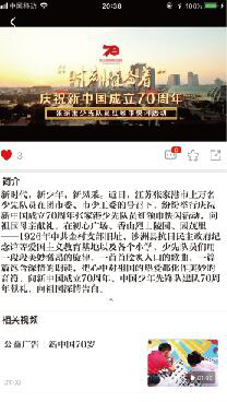 (十)“张家港万名少先队员为祖国时刻准备着”快闪短视频。在团市委、市少工委的号召下,由“今日张家港”APP策划组织,张家港市上万名少先队员加入庆祝新中国成立70周年红领巾快闪活动,向祖国母亲献礼。在初心广场、香山烈士陵园、园茂里——1926年中共金村支部旧址、沙洲县抗日民主政府纪念馆等各个点位拍摄。少先队员们用美妙激昂的旋律,脍炙人口的歌曲,饱含深情的朗读,把心中对祖国的热爱都化作美妙的音符,向新中国成立70周年、中国少年先锋队建队70周年献礼,向祖国深情告白。