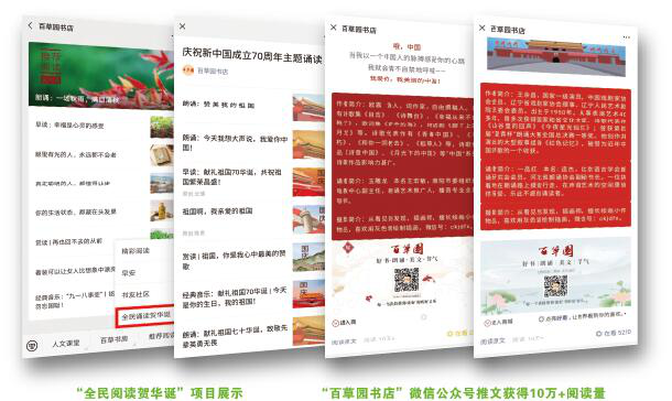 (一)构造主题内容,贴近时代发展要求。“百草园书店”微信公众号以社会主义核心价值观为导向,持续制作弘扬中华优秀传统文化的图文及音视频内容,在互联网中推送了大量积极、和谐、充满正能量的文化内容。目前,“百草园书店”微信公众号每日发布8条信息,包含“朗诵”“早读”“赏读”“荐书坊”等多个栏目,涉及图书推荐、人生哲理、生活态度、主题教育、节点热点等多个主题类别。在新中国成立70周年的2019年里,百草园书店特别策划“全民诵读贺华诞”主题诵读活动,邀请知名诗人和主播每月创作并朗诵爱国主义题材诗歌,《我爱你,我美丽的中国》《赞美中国》《青春中国》等16篇诵读作品赢得了超过500万读者的阅读和互动,广泛传播了爱国主义情怀。