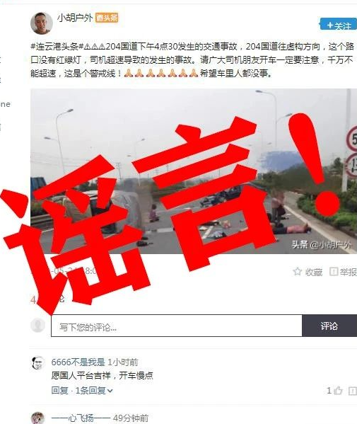 5月24日,今日头条网民“小胡户外”发帖称,“204国道连云港段下午4点30分发生交通事故”,并配发多张极其惨烈的交通事故现场照片。连云港市网信办联合网警第一时间研判,并经多方核实:该帖文系不实信息,近期204国道连云港段未发生类似交通事故,帖文所配发的图片实为几年前外地一起交通事故现场。