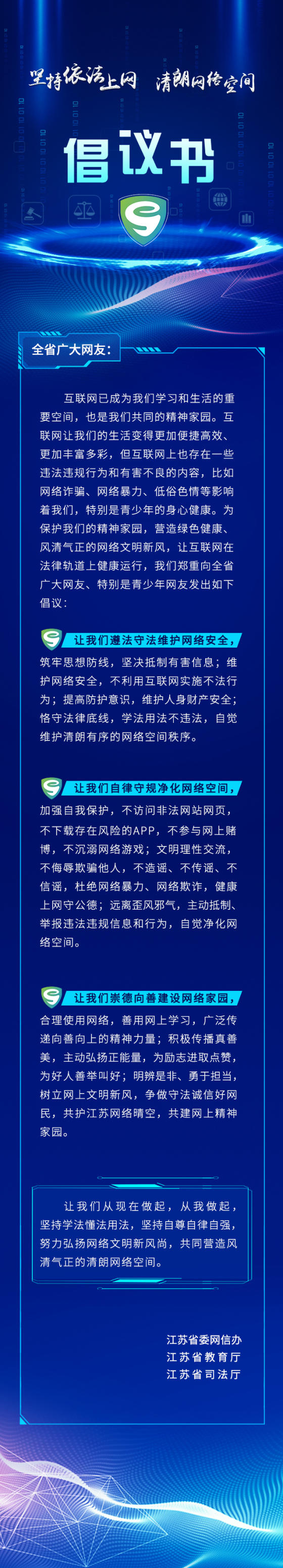 6月1日,《中华人民共和国网络安全法》颁布施行三周年,由江苏省委网信办、江苏省教育厅、江苏省司法厅共同主办的江苏省2020年度网信普法活动暨全省“百网百校”“网法融通梦想 护卫清朗少年”联合普法活动线上启动。