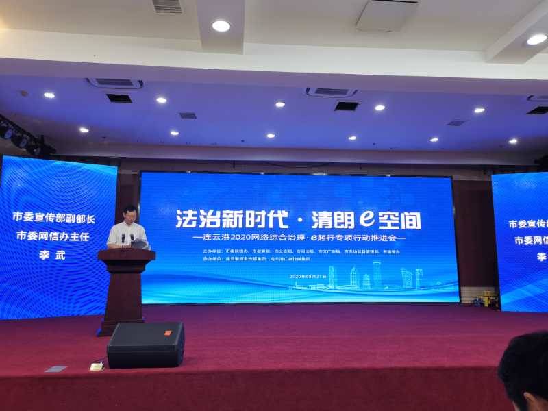 8月21日上午,连云港市委网信办联合市教育局、市公安局、市司法局、市文广旅局、市市场监督管理局、市通管办共同举办“法治新时代·清朗e空间 连云港2020网络综合治理·e起行”专项行动推进会。市委宣传部副部长、市委网信办主任李武致辞。