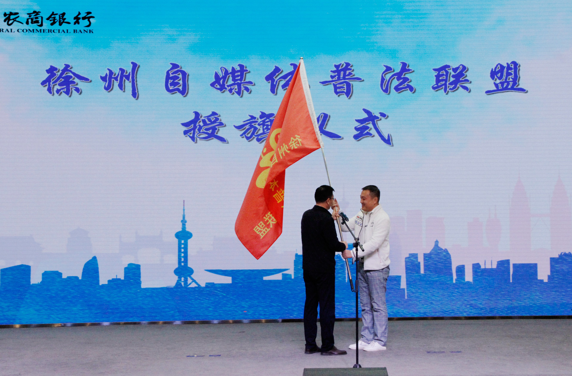 1月22日,在徐州农商银行三楼多功能报告厅市举办徐州自媒体普法联盟成立仪式,徐州市司法局党组书记、局长曹柱生向自媒体代表“猪屁登”IP创始人魏亚授旗。徐州市委依法治市办、市委网信办、市法宣办、市司法局、徐州农商银行相关负责人参加活动。
