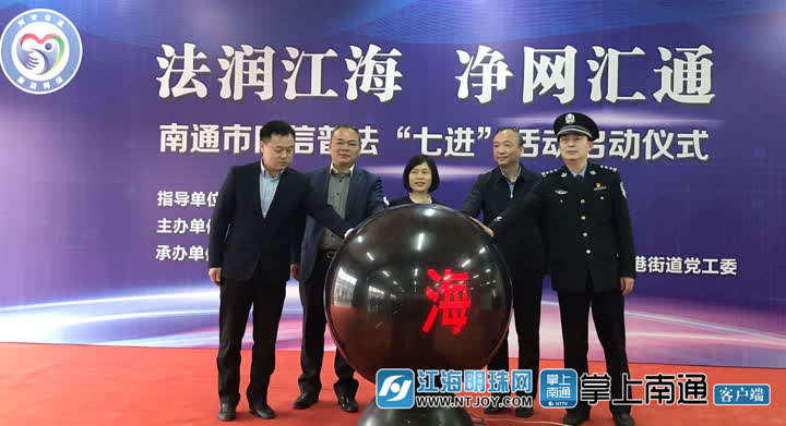省委网信办网管处处长郑琰滢,南通市委宣传部副部长、网信办主任俞雷,崇川区委常委、宣传部长张伟明,市公安局网安支队支队长张建,任港街道党委书记高峰共同启动“法润江海净网汇通”——南通市网信普法“七进”活动。