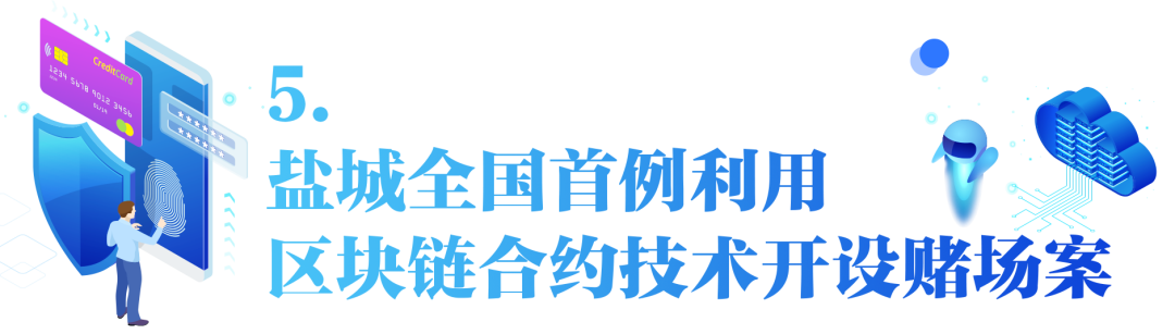 2020年12月,盐城公安机关成功打掉一个利用区块链合约技术开设赌场的网络平台,抓获犯罪嫌疑人13名,查扣涉案虚拟币130余万个,价值2600余万元。查明自2018年6月以来,犯罪嫌疑人胡某宇伙同刘某功、谢某非组织11名技术人员,在境外某区块链合约技术平台上开设网络赌场,参赌人员7.3万余人,交易流水80亿元,违法所得6000余万元,涉及境内外多个国家和地区。此案是全国首例利用区块链合约技术开设赌场案,成功侦办在全国首开先河。