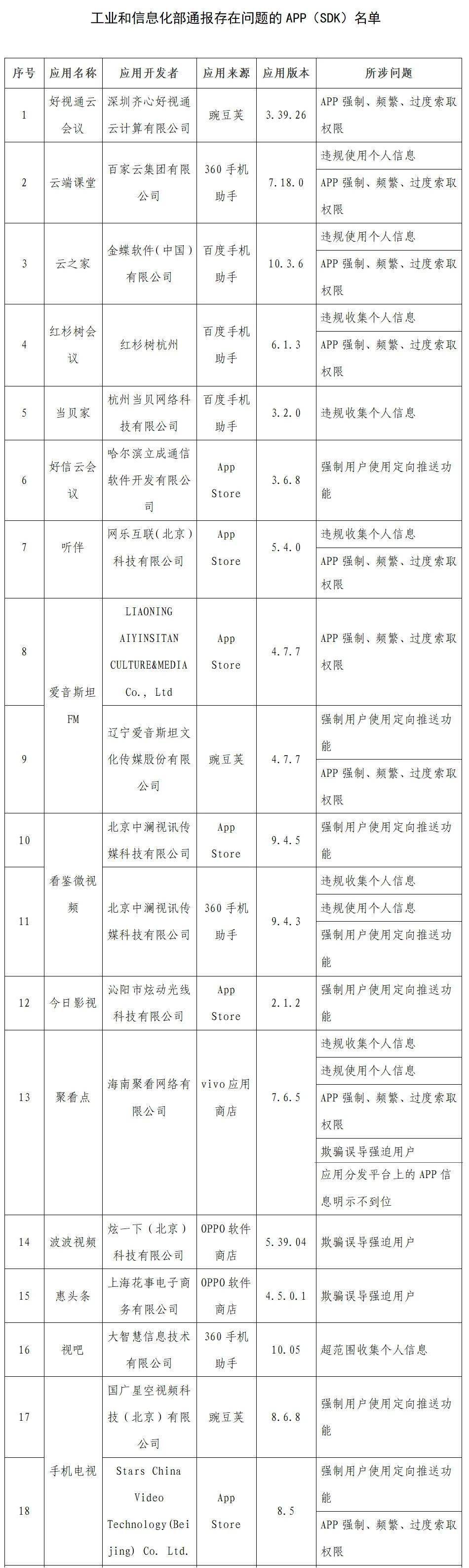 附件:工业和信息化部通报存在问题的APP(SDK)名单