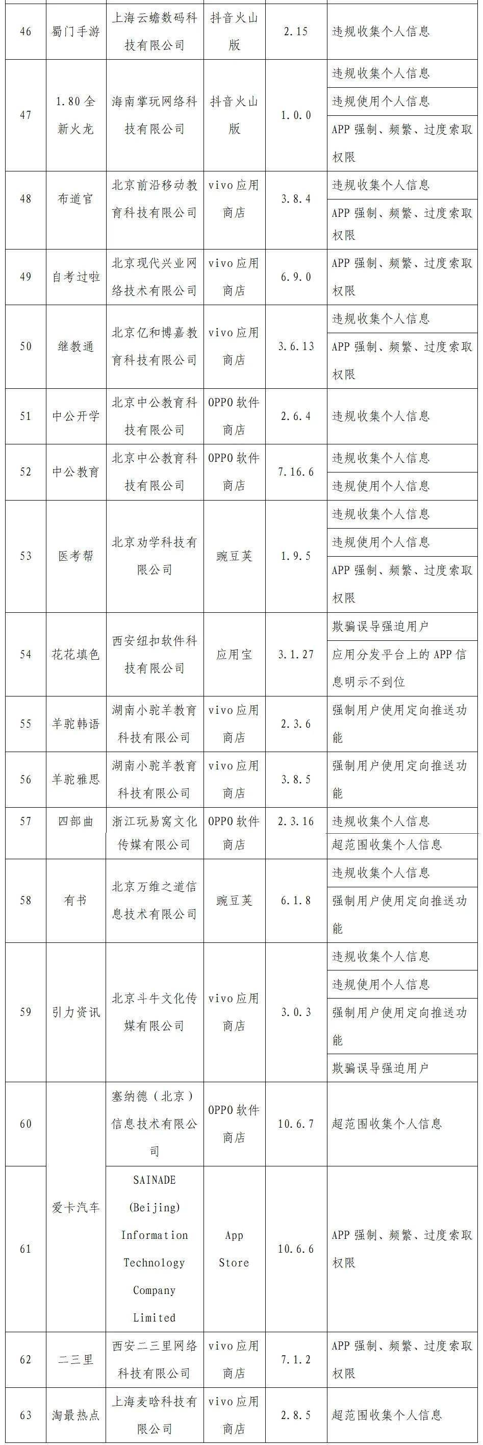 依据《个人信息保护法》《网络安全法》《电信条例》《电信和互联网用户个人信息保护规定》等法律法规,我部近期组织第三方检测机构对移动互联网应用程序(APP)进行检查,截至目前,尚有107款APP未完成整改。同时,检测过程中发现,13款内嵌第三方软件开发工具包(SDK)存在违规收集用户设备信息的行为(详见附件)。