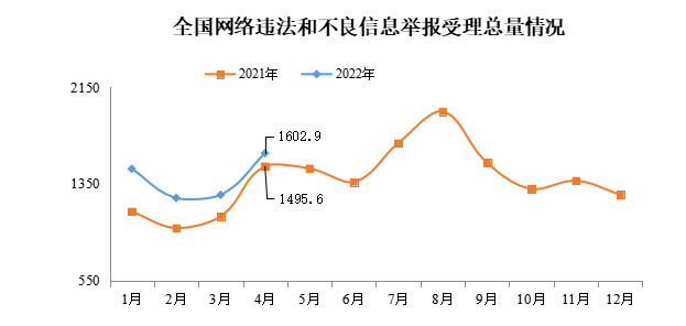 2022年4月,全国各级网络举报部门受理举报1602.9万件,环比增长27.4%、同比增长7.2%。其中,中央网信办(国家互联网信息办公室)违法和不良信息举报中心受理举报50.6万件,环比增长36.0%、同比增长164.7%;各地网信办举报部门受理举报80.6万件,环比下降4.4%、同比下降23.9%;全国主要网站受理举报1471.8万件,环比增长29.4%、同比增长7.4%。