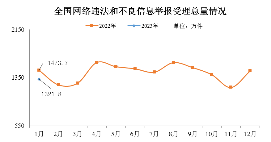 2023年1月,中央网信办举报中心指导全国各级网信举报工作部门、主要网站平台受理网民举报色情、赌博、侵权、谣言等违法和不良信息1321.8万件,环比下降9.6%、同比下降10.3%。其中,中央网信办举报中心受理举报57.9万件,环比下降13.7%、同比增长58.5%;各地网信举报工作部门受理举报66.6万件,环比下降13.8%、同比下降32.1%;全国主要网站平台受理举报1197.4万件,环比下降9.2%、同比下降10.6%。